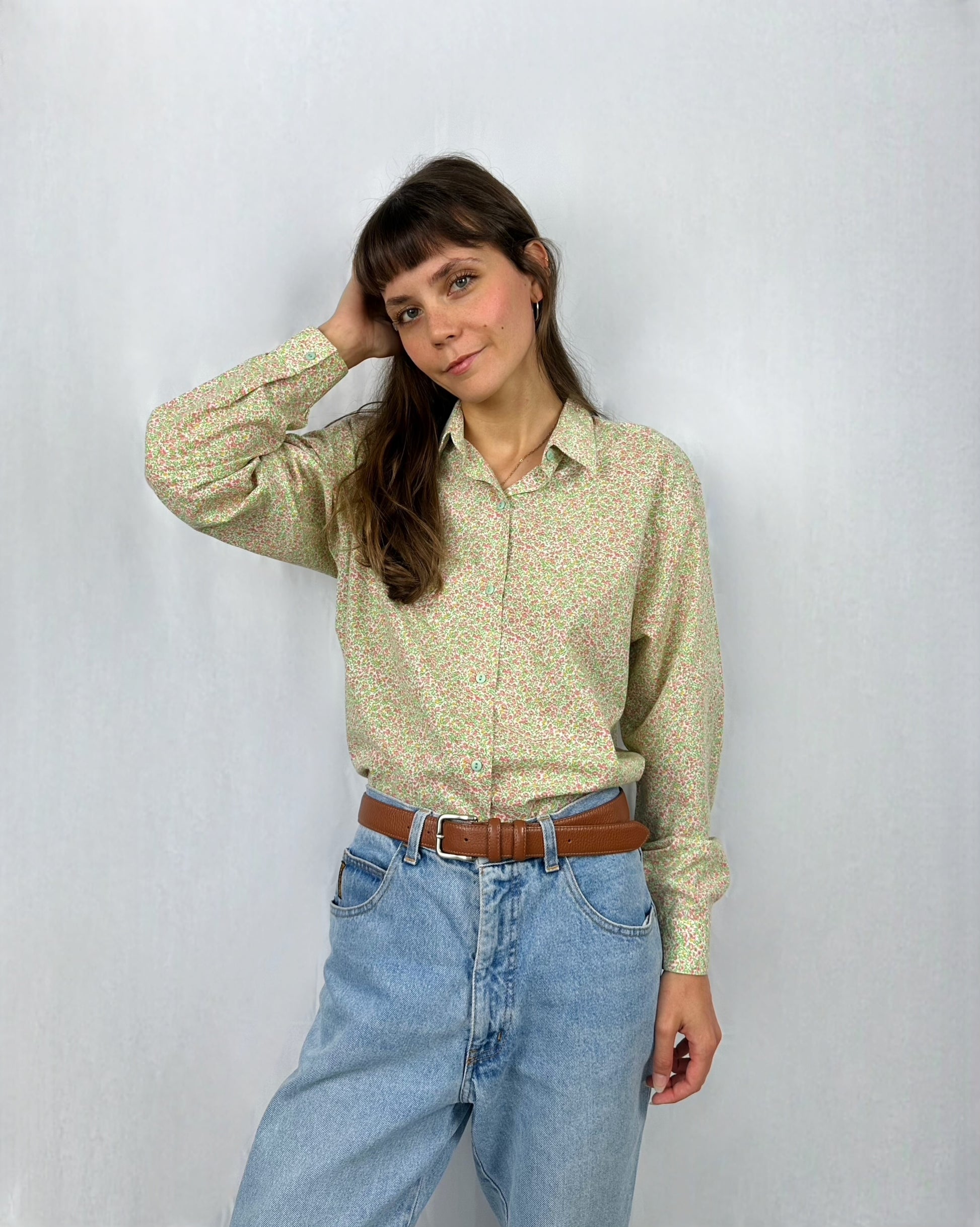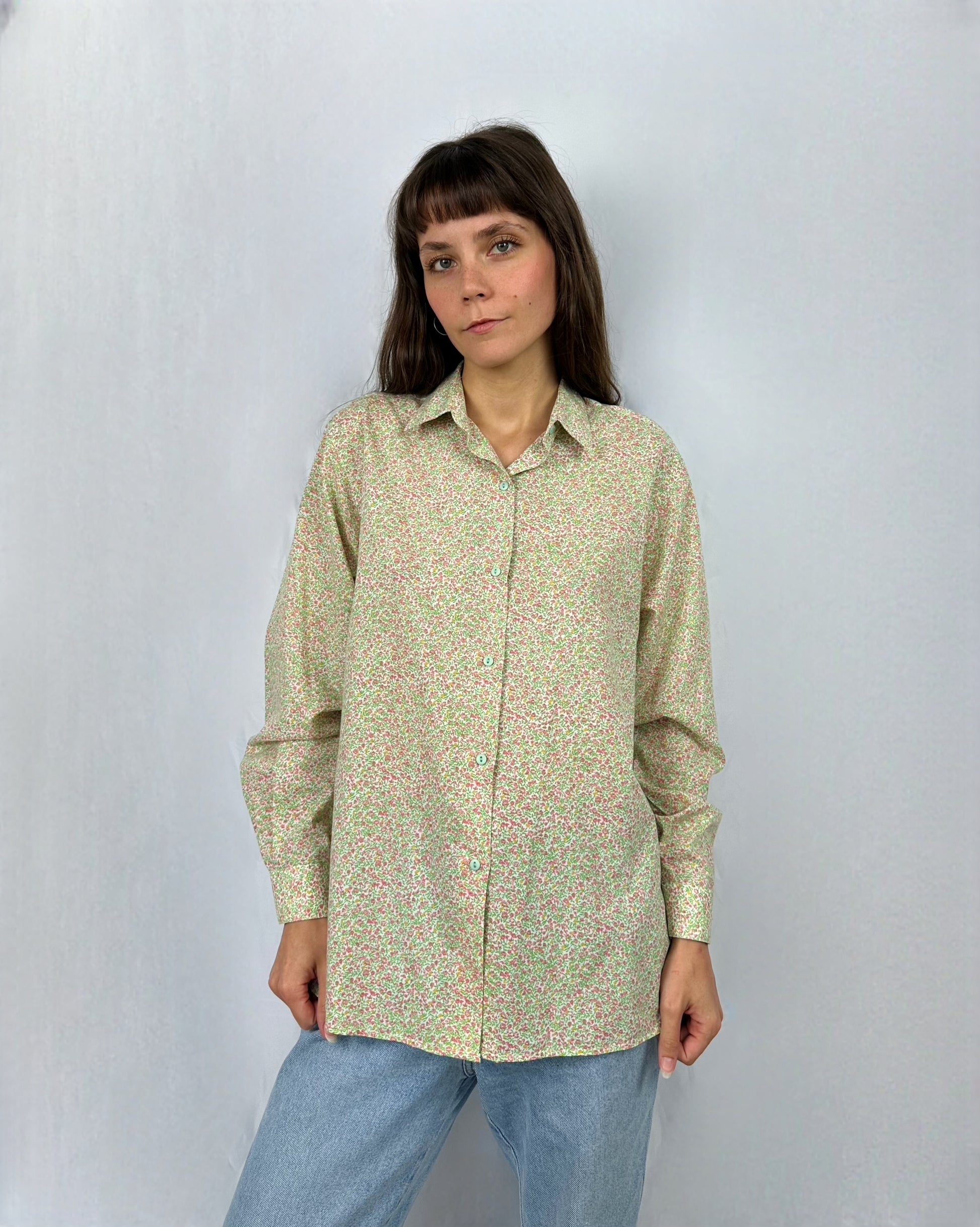 Questa camicia in cotone verde chiaro con piccoli fiori rosa sparsi è un capo fresco e delicato; il tessuto leggero garantisce comfort e traspirabilità durante tutta la giornata. Il taglio classico con colletto tradizionale e bottonatura frontale mantiene un’eleganza semplice e versatile.