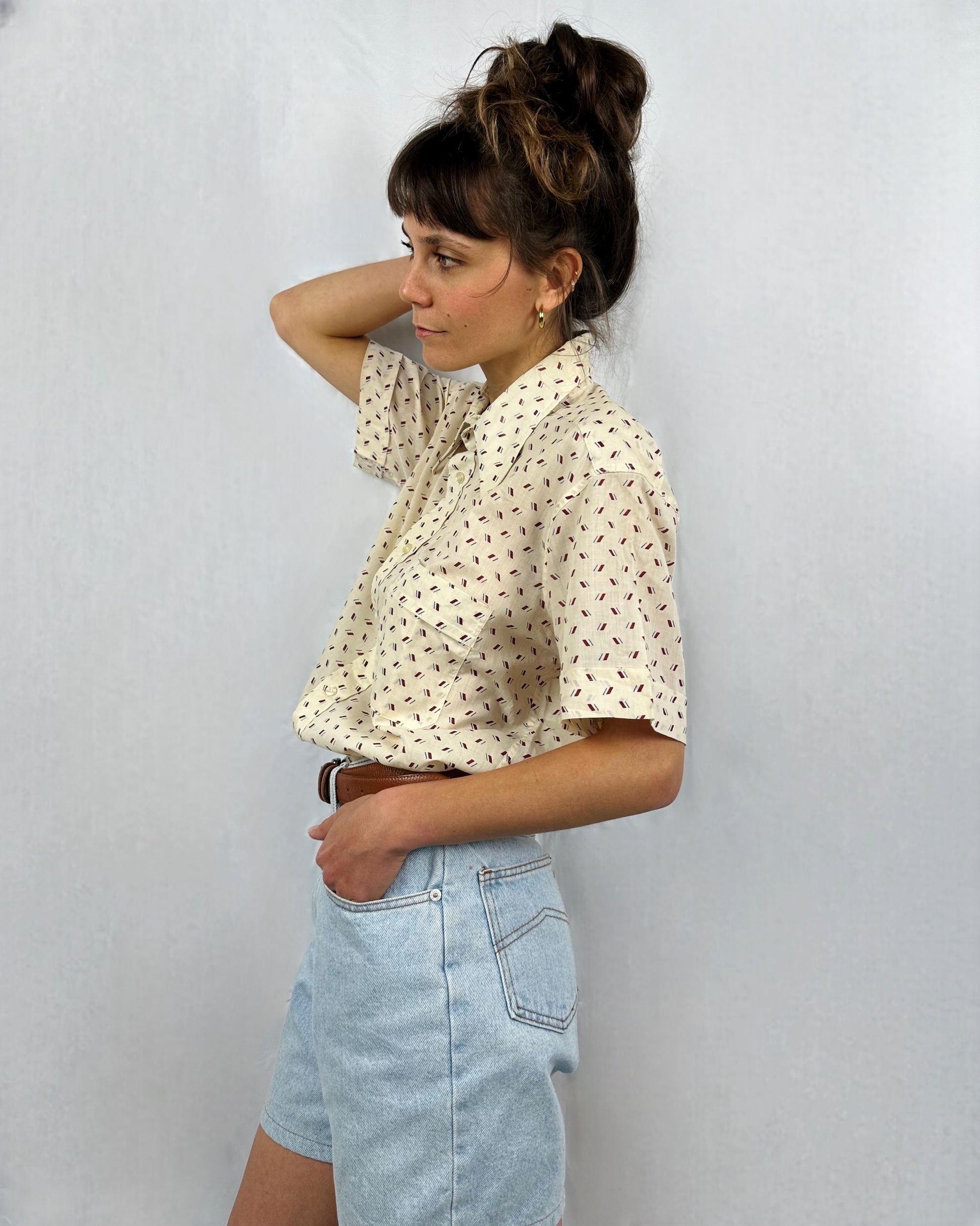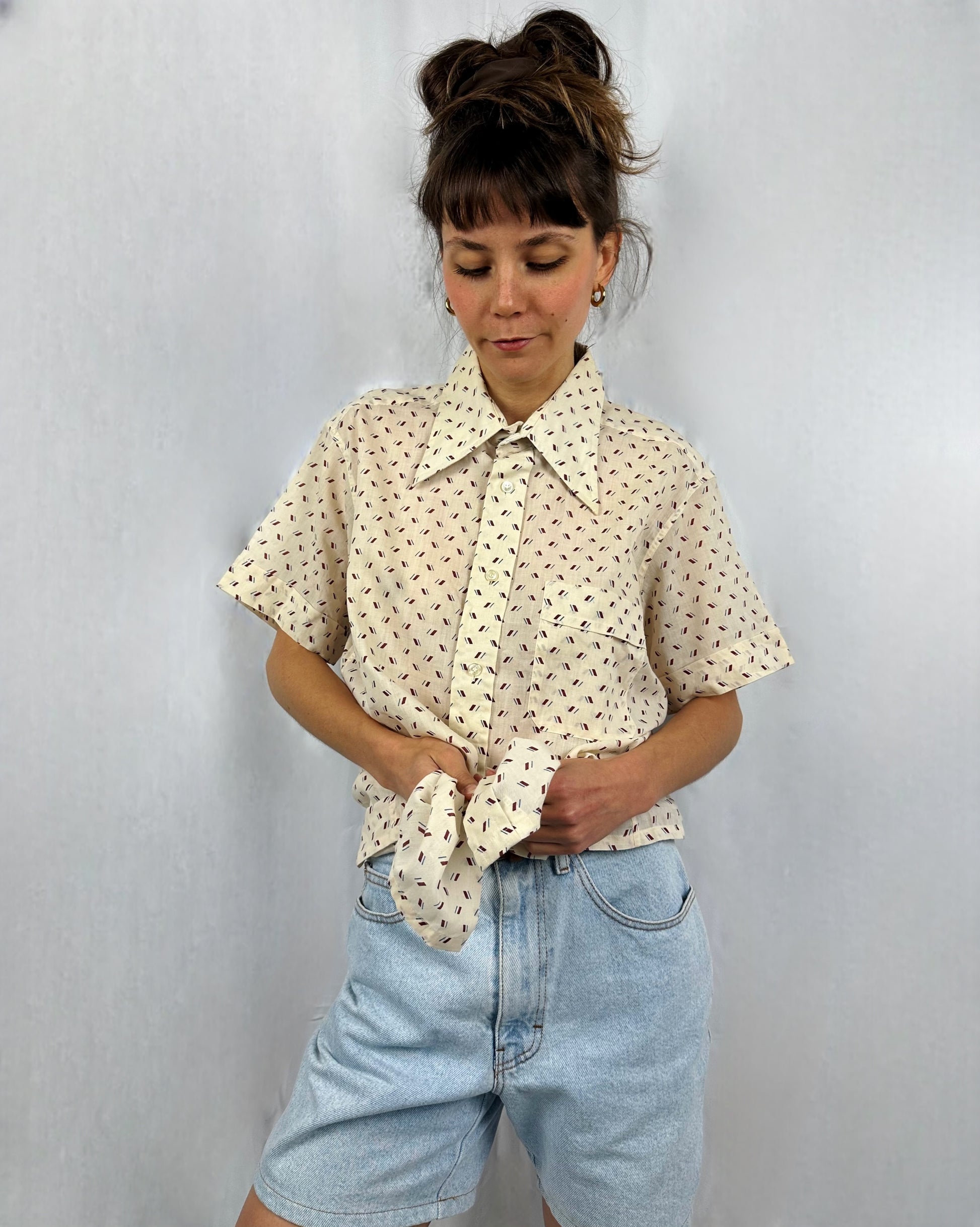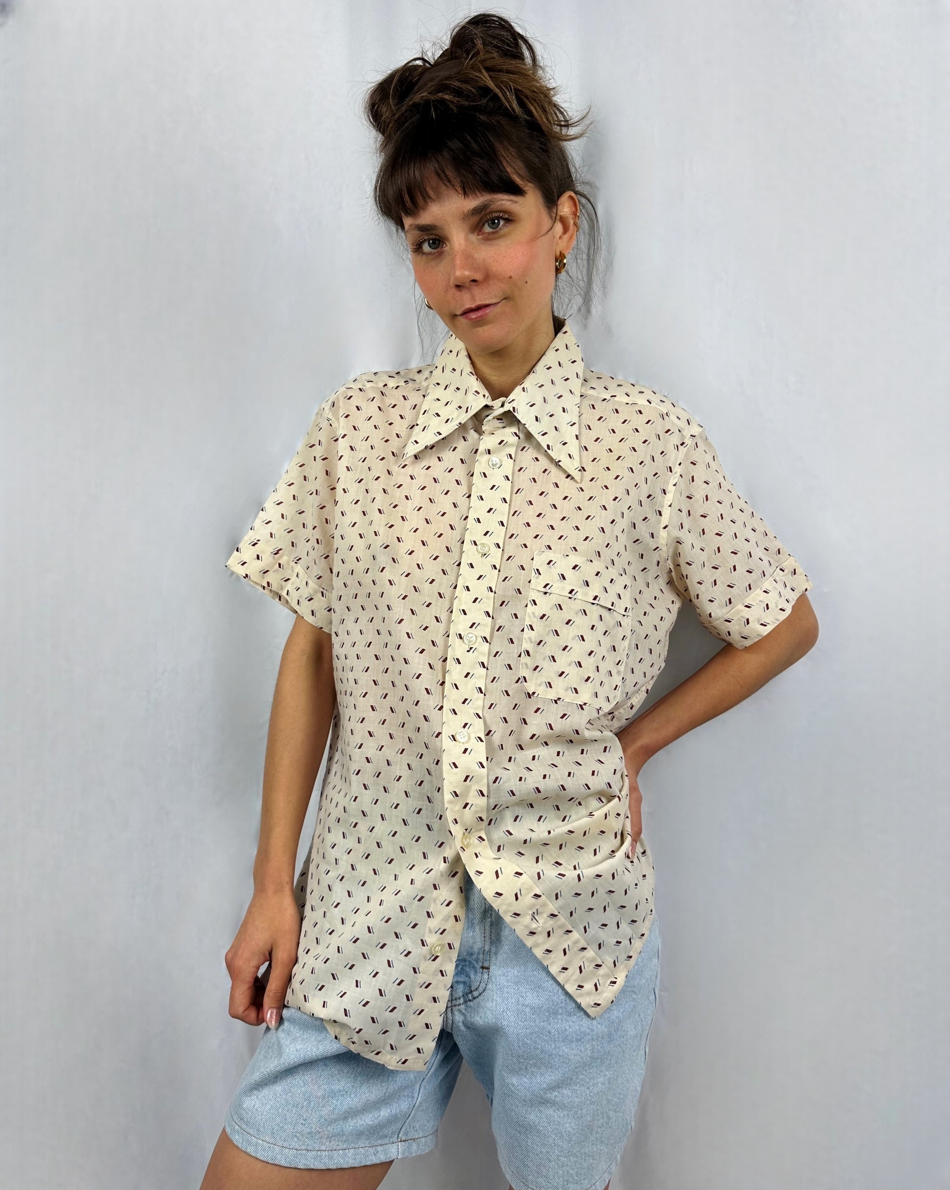 Camicia a maniche corte anni ’70, dal caratteristico colletto allungato e appuntito, tipico dello stile dell’epoca. Il colore di base è un panna, arricchito da una piccola fantasia di lineette sparse nei toni del blu e bordeaux, che crea un effetto discreto ma distintivo. Il tessuto è puro cotone, quindi morbida e leggera.
