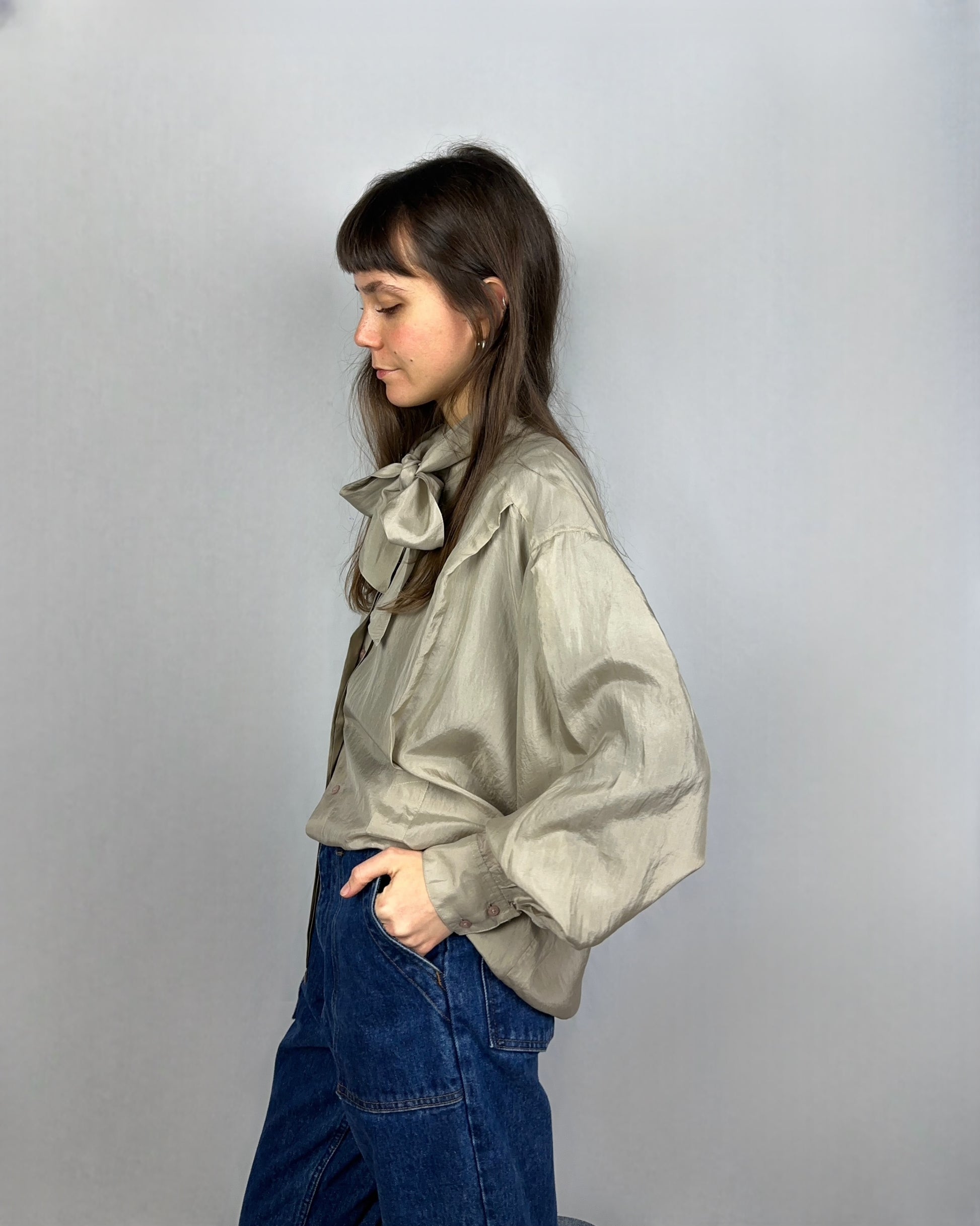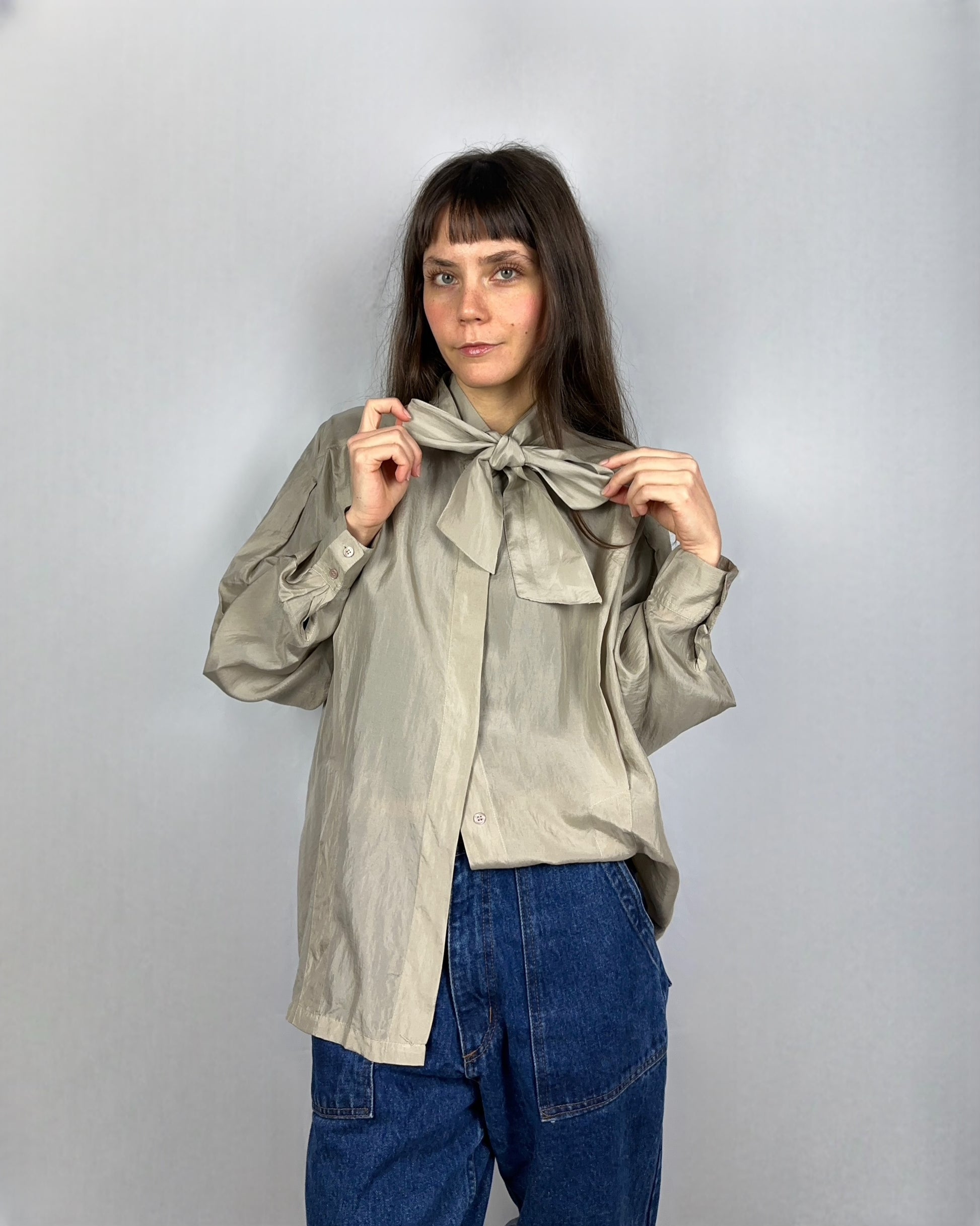 Camicia realizzata in pura seta, dal colore beige neutro e versatile. Caratterizzata da lacci rimovibili che permettono di creare un raffinato fiocco, aggiungendo un tocco di personalità all'outfit.