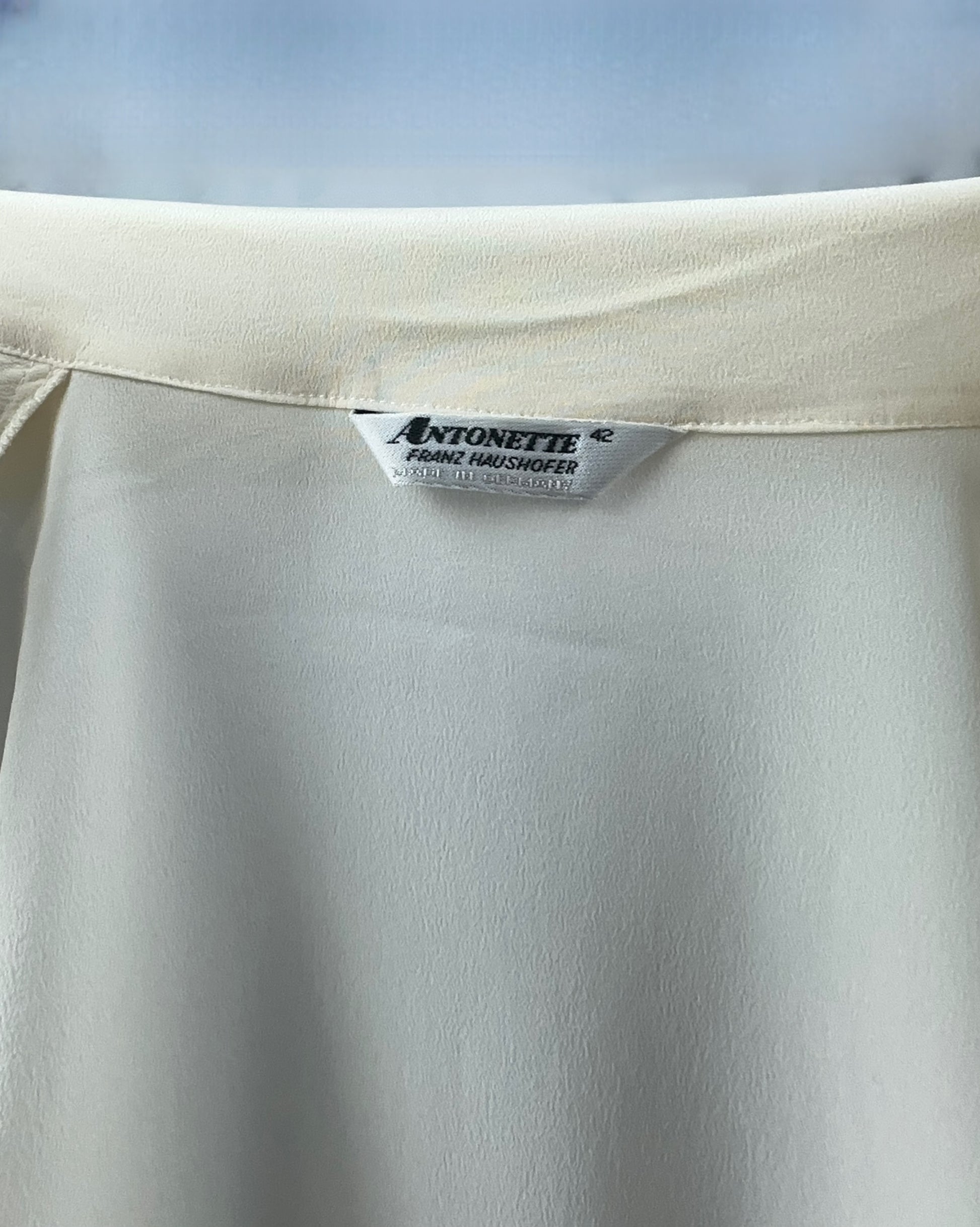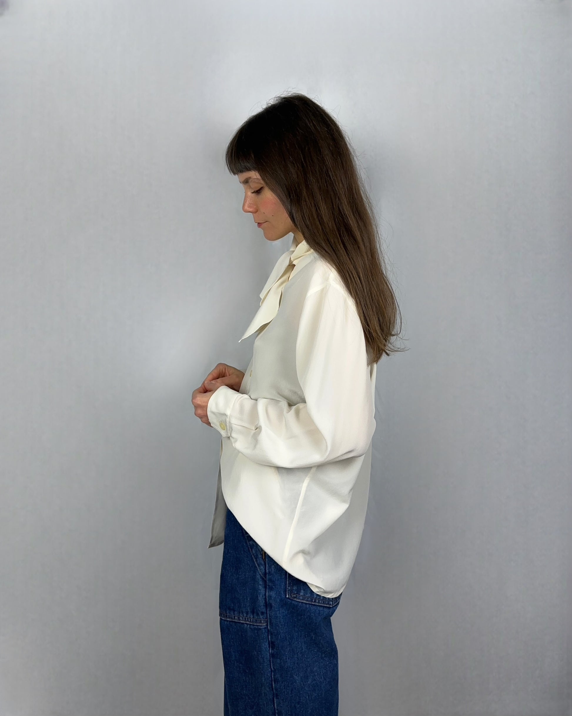 Elegante camicia in pura seta dal colore panna, caratterizzata da un raffinato fiocchetto frontale che richiama l'effetto foulard. Il dettaglio decorativo conferisce un tocco sofisticato e versatile. La seta garantisce una caduta fluida e una sensazione di lusso al tatto, mentre la tonalità neutra si abbina facilmente con qualsiasi guardaroba.