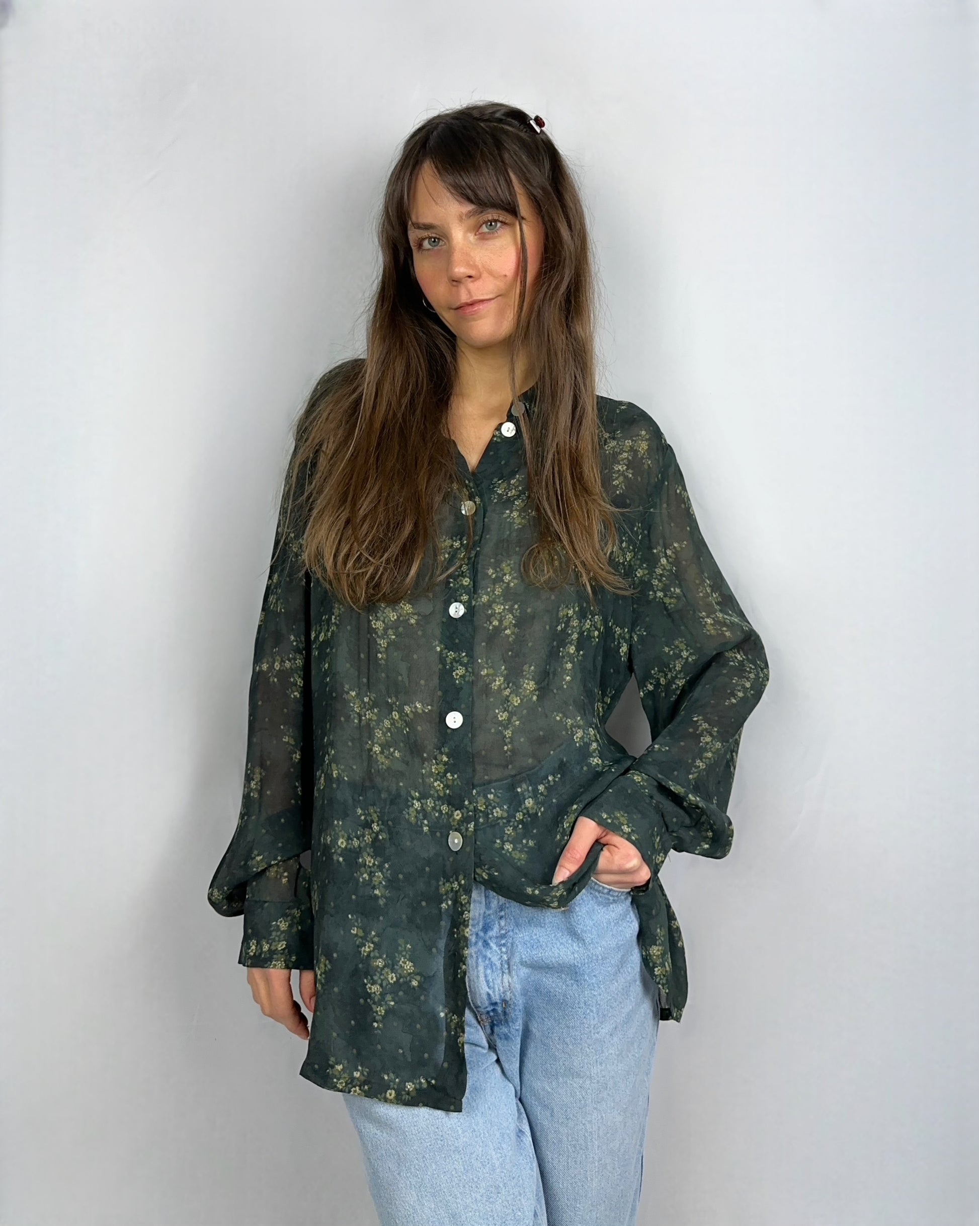 Elegante camicia in viscosa 100% con bottoni in madreperla che cattura l'essenza dello stile vintage con un delicato motivo floreale in tonalità di verde. La trama semi-trasparente conferisce leggerezza e fluidità, perfetta per outfit sia in occasioni formali che casual. Ideale da indossare da sola o stratificata, questa camicia combina comfort naturale con un'estetica sofisticata e senza tempo.