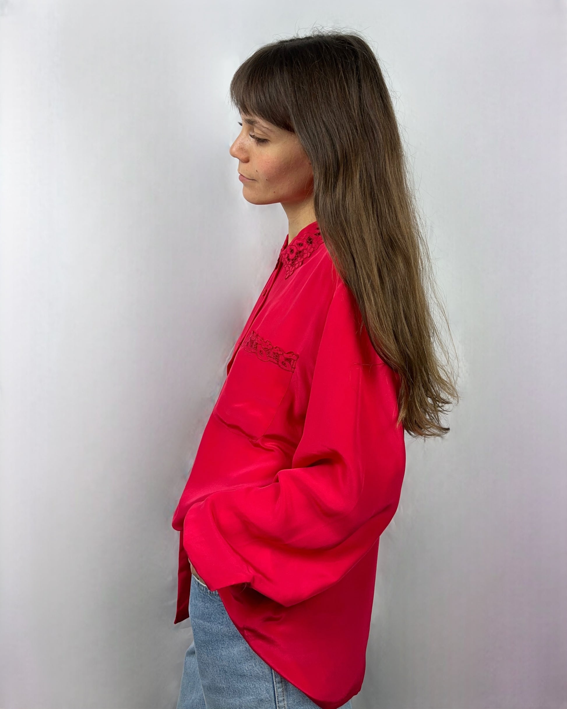Elegante camicia in pura seta color lampone acceso; il colletto e i polsini sono impreziositi da delicati ricami tono su tono. Un capo sofisticato che unisce vivacità e stile senza tempo.