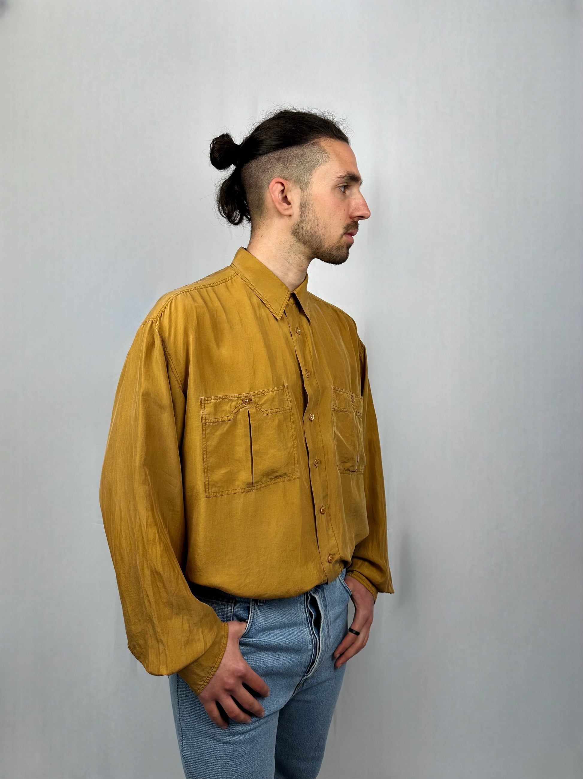 Questa camicia anni '80 in pura seta color giallo ocra, firmata Angelo Litrico, è un vero e proprio pezzo di storia della moda. Le sue maniche a sbuffo, strette al polso e ampie nella parte superiore, e i bottoncini tono su tono donano un tocco di originalità e romanticismo. Un capo che unisce comfort, eleganza e un fascino retrò.