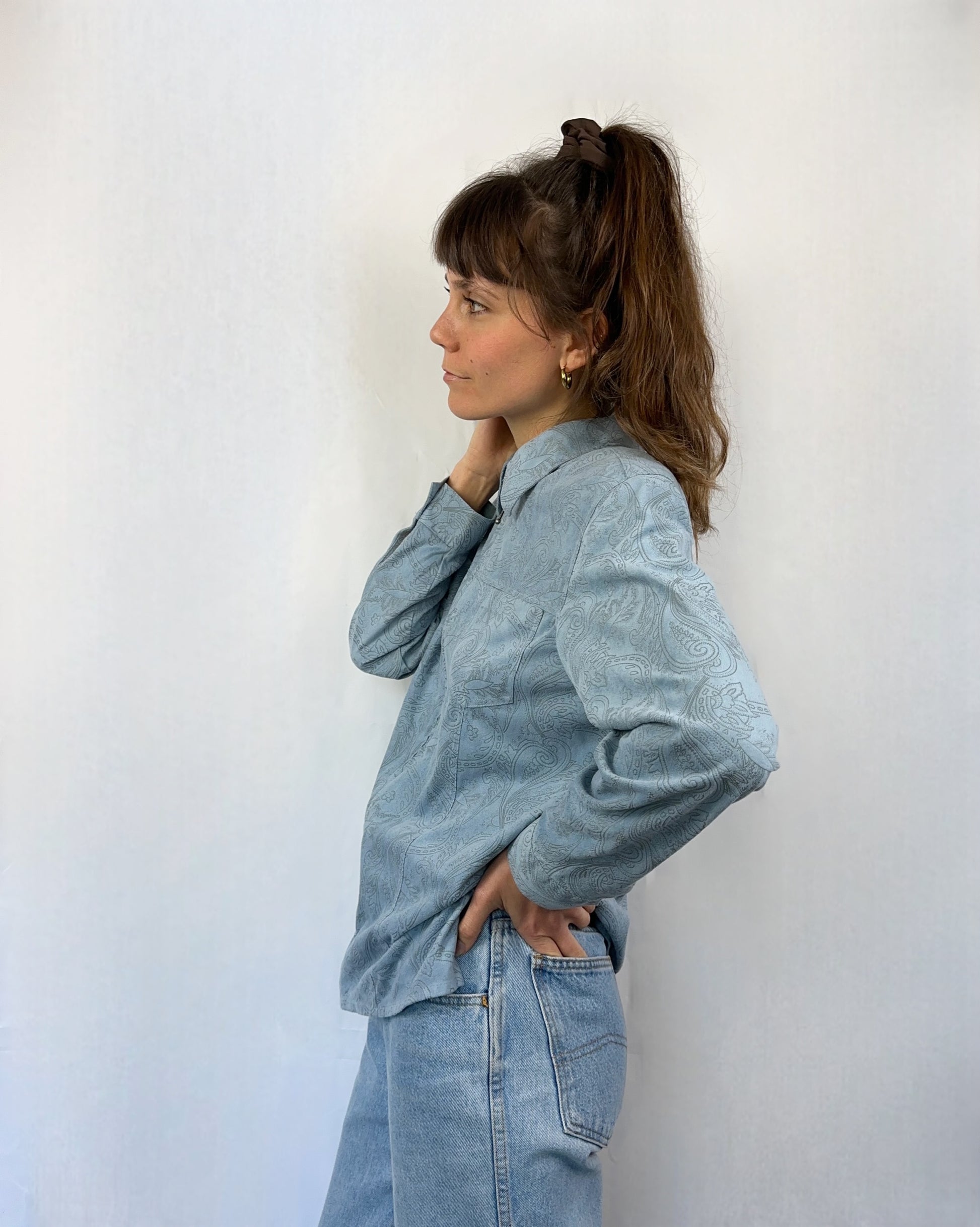 Questa giacchetta firmata Bonita unisce la leggerezza di una camicia alla struttura di un capo spalla. Realizzata in tessuto (poliestere) effetto pelle scamosciata, ha un finish vellutato e opaco che richiama il camoscio restando morbido. Il delicato azzurro pastello le conferisce un’eleganza discreta, mentre il motivo decorativo astratto e sinuoso aggiunge movimento e carattere senza risultare invadente. Il taglio è comodo ma curato, con cerniera frontale e colletto leggero. Ha delle spalline rimovibili.