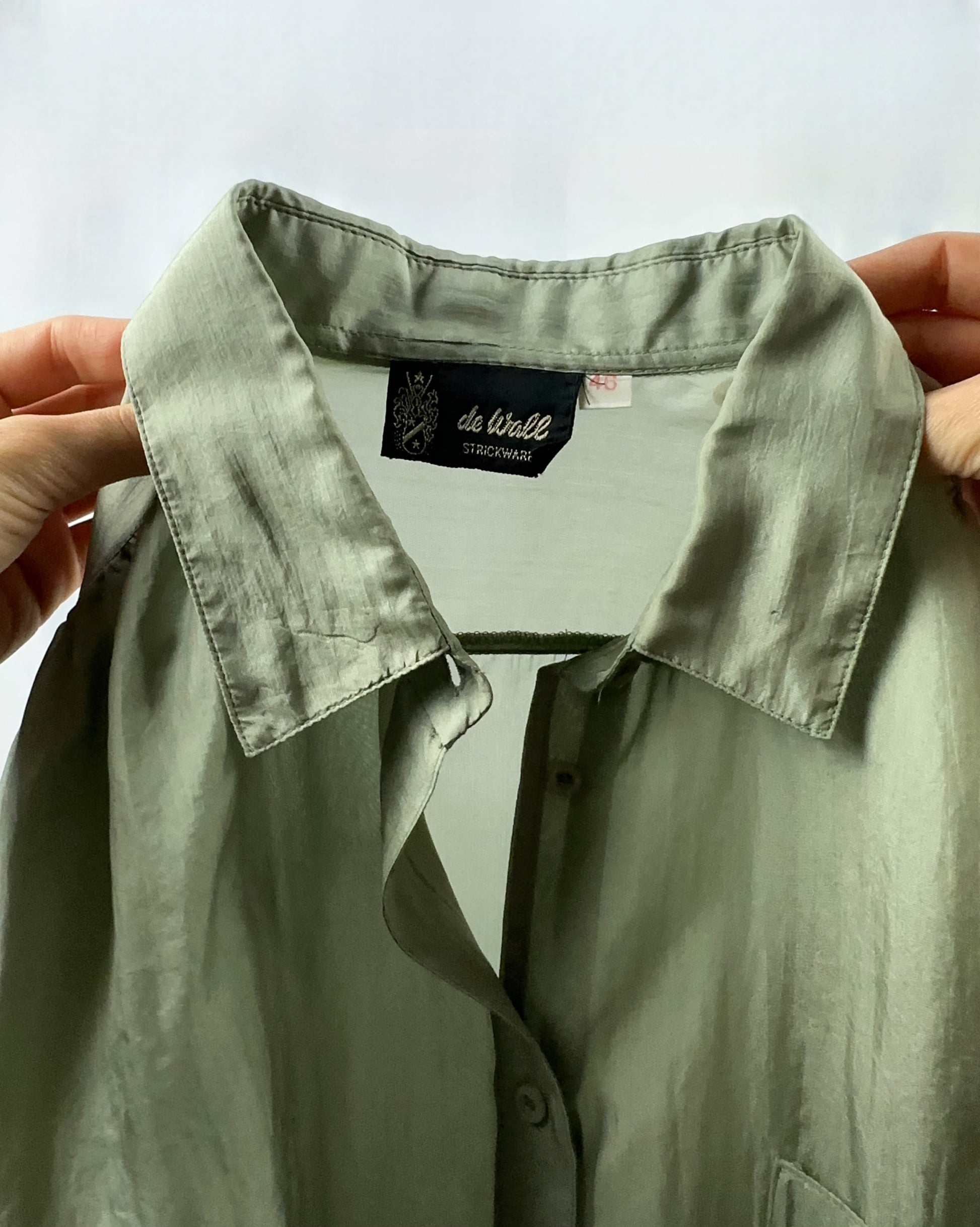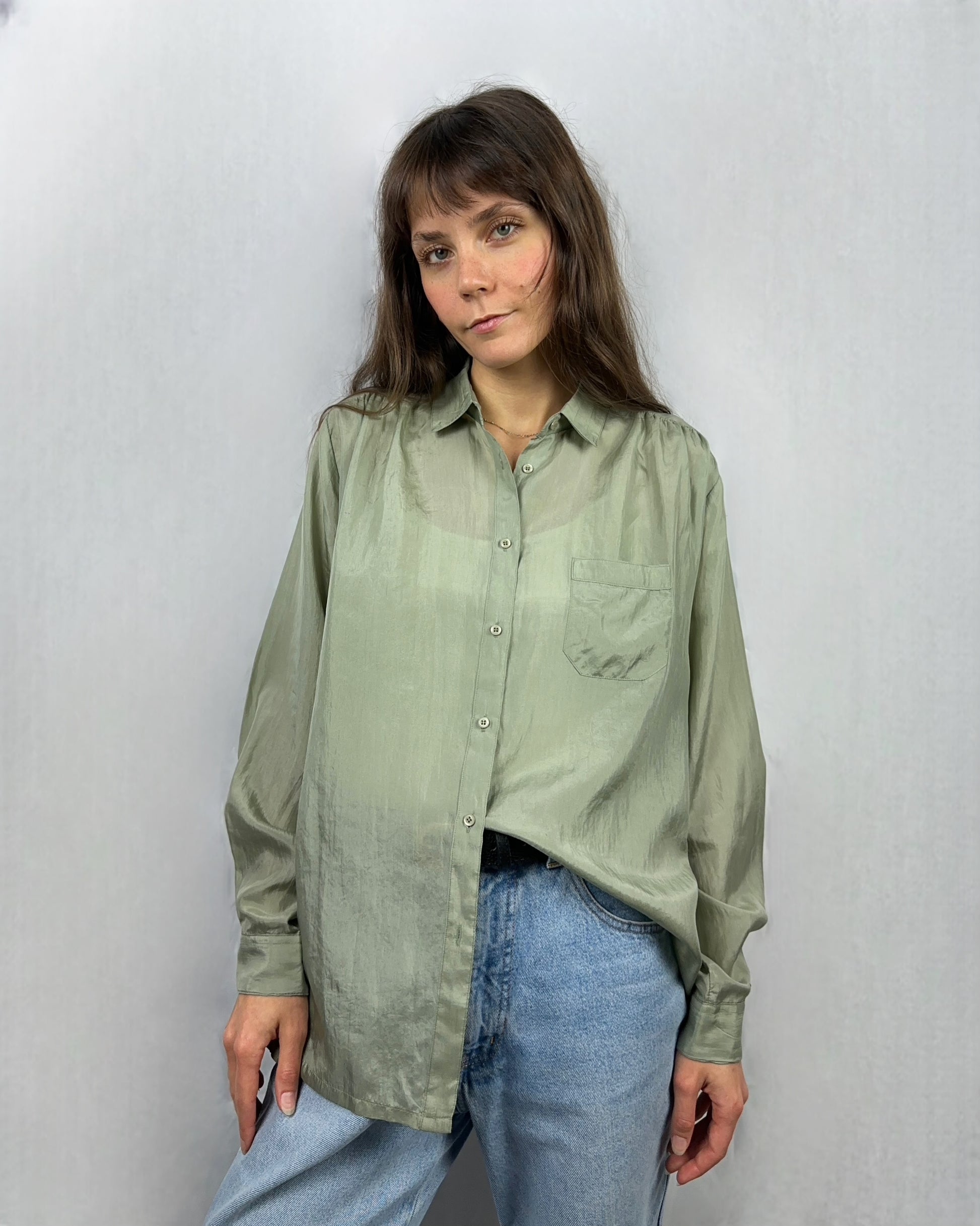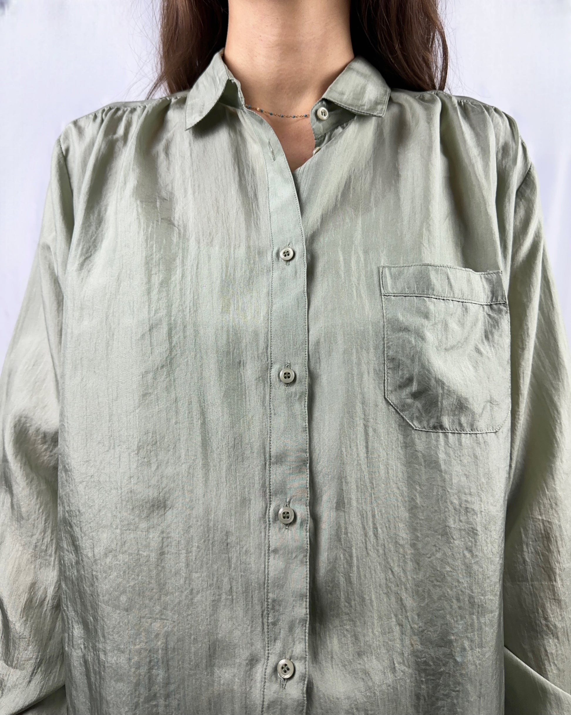 Camicia in pura seta color salvia, sobria e raffinato. Il tessuto leggero e luminoso valorizza la tonalità delicata, offrendo una vestibilità fluida e confortevole. Un capo elegante e versatile.