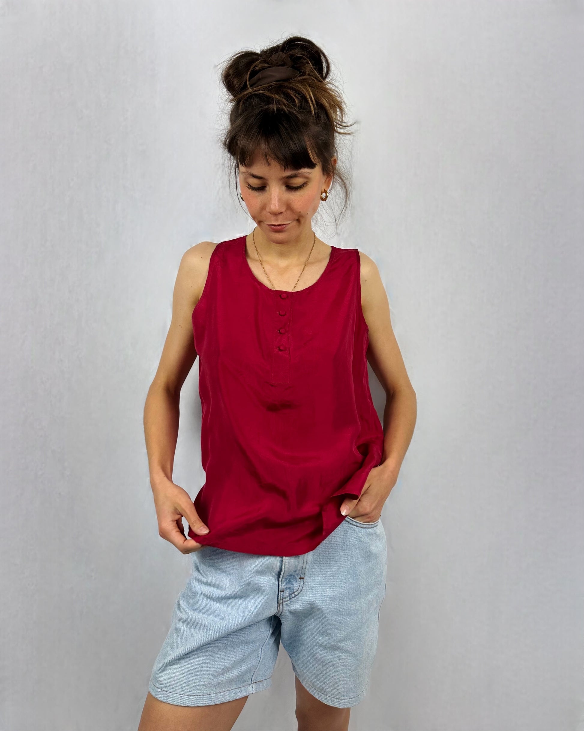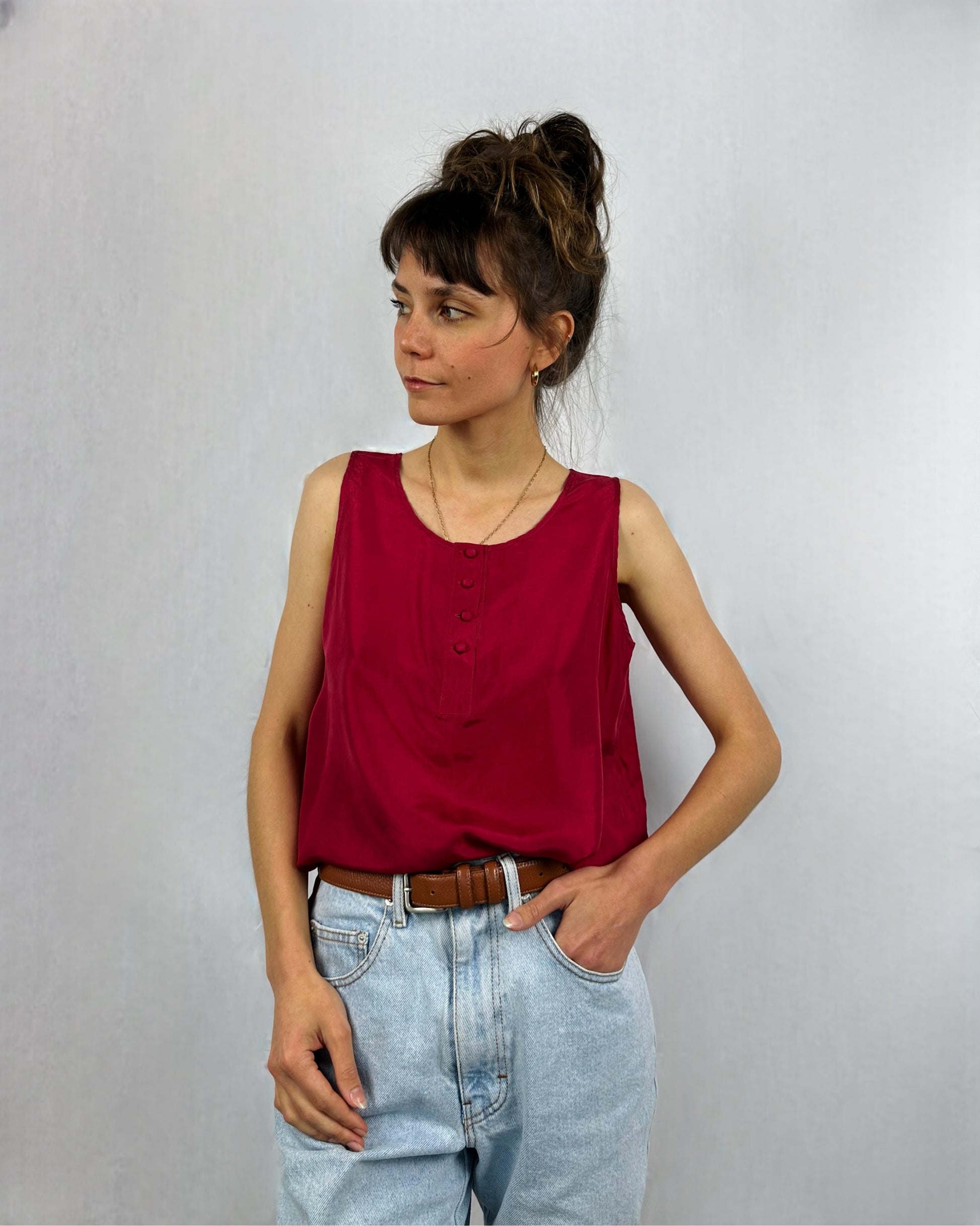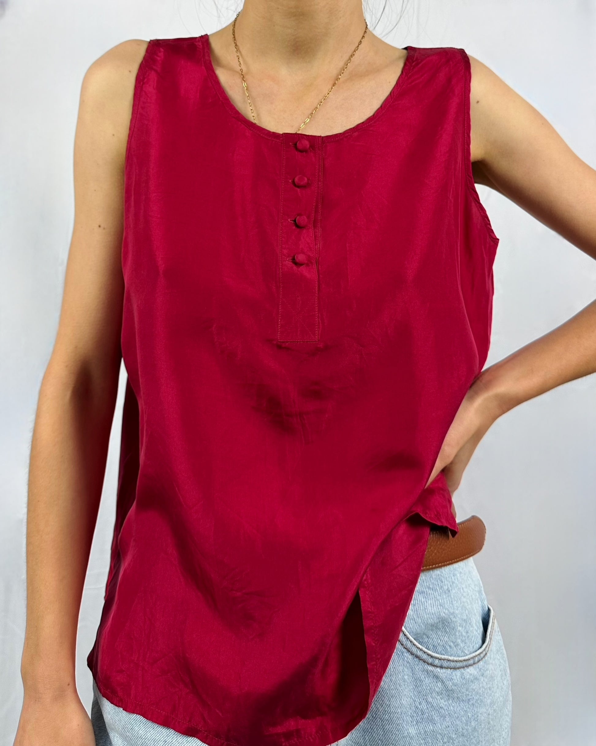 Canotta in pura seta color rosso ciliegia, luminosa e raffinata, dal taglio semplice ma curato nei dettagli. Sotto lo scollo rotondo si trovano quattro piccoli bottoncini tono su tono, che aggiungono un tocco delicato. Il tessuto fluido e leggero scivola morbidamente sul corpo, rendendola perfetta sia da sola che sotto un blazer o una camicia aperta, per un look versatile.