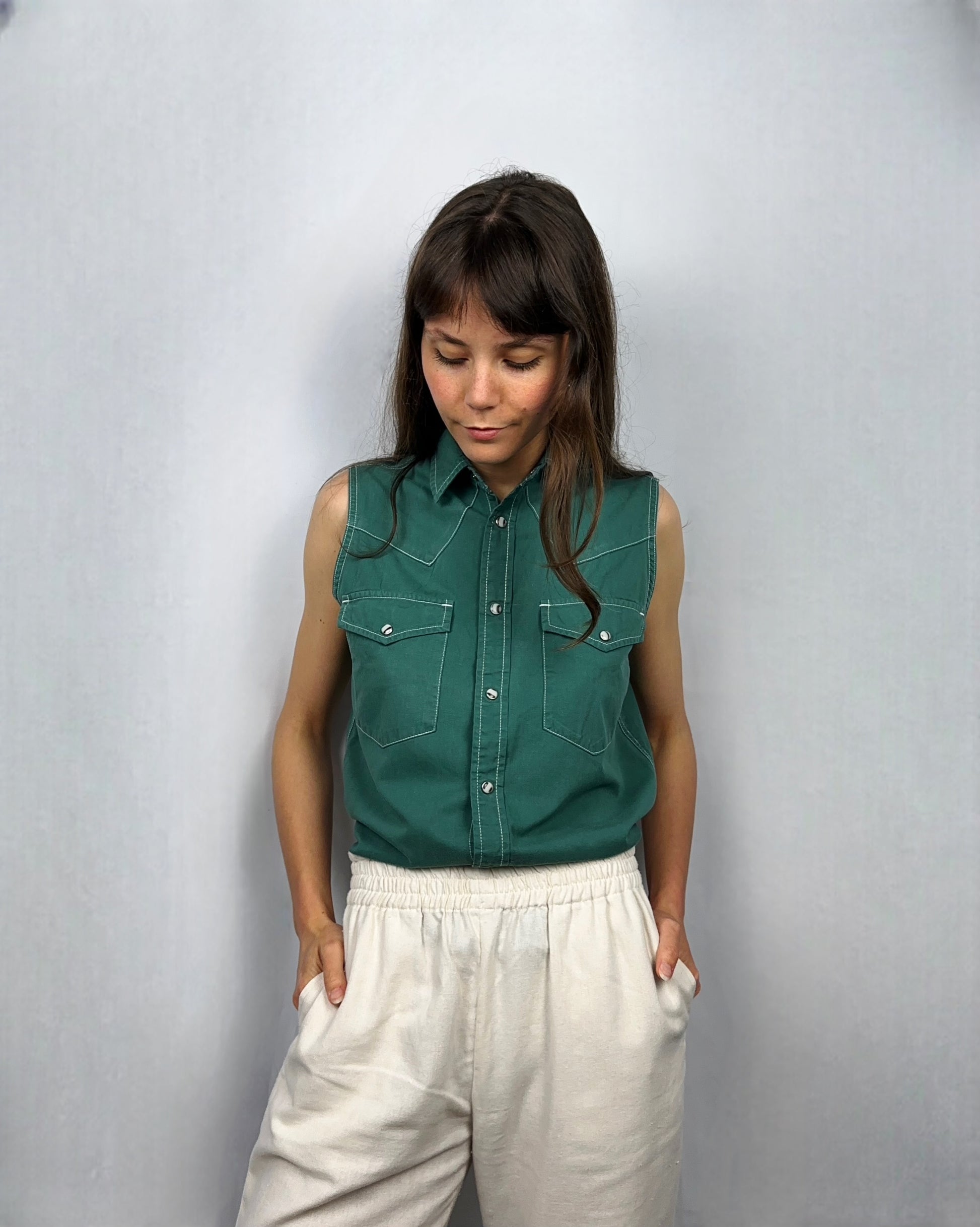 Fresca, essenziale e ricercata nei dettagli, questa canotta verde in denim leggero del brand Trinity è un capo versatile perfetto per l’estate. Il design pulito è valorizzato da un tessuto denim ultra leggero e morbido, in una tonalità verde sobria ma originale; questa canotta è ideale sia per la città/lavoro che per il tempo libero. In puro cotone.