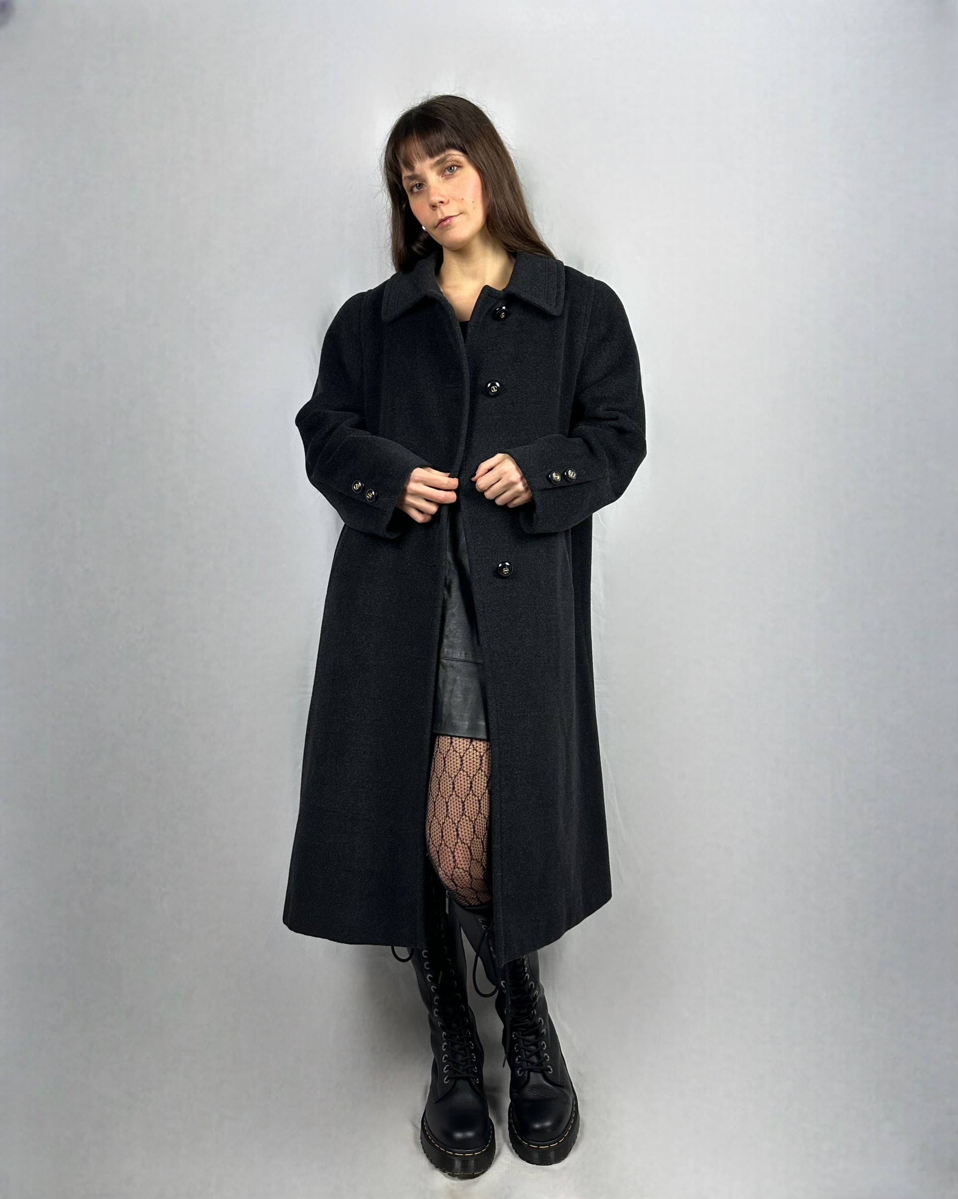 Elegante cappotto in pura lana vergine, realizzato con un tessuto di qualità superiore che garantisce calore e durabilità nel tempo. La tonalità grigio scuro, versatile e sofisticata, si abbina facilmente a qualsiasi guardaroba. La lunghezza generosa offre una forma elegante e raffinata, perfetta per occasioni formali e uso quotidiano. Ha le spalline imbottite.