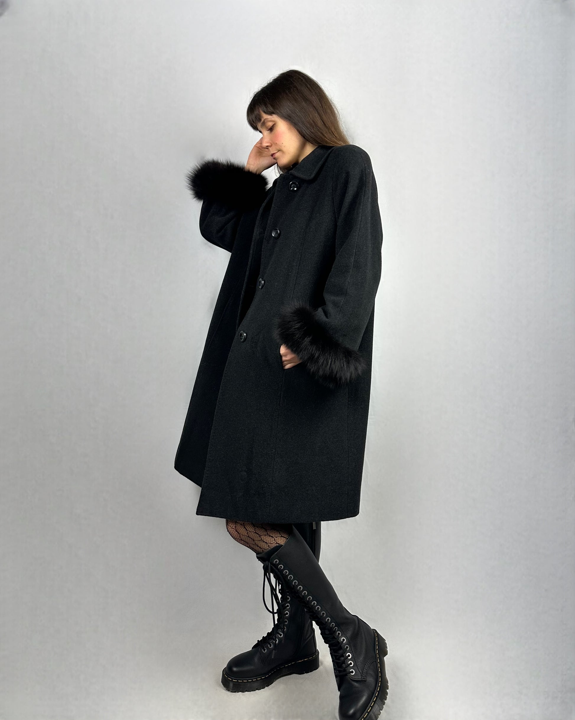 Cappotto in lana dalle linee raffinate e senza tempo, garantisce calore e comfort durante i mesi più freddi. La tonalità grigio scuro conferisce versatilità e eleganza a qualsiasi guardaroba, abbinandosi facilmente con numerosi outfit. I polsini rifiniti in pelliccia (non riporta se vera o sintetica, ma sono molto belli e morbidi) aggiungono un tocco di lusso e sofisticatezza, proteggendo dal freddo con stile. Un capo essenziale per chi ricerca qualità costruttiva e design classico. Le spalline sono imbottite.