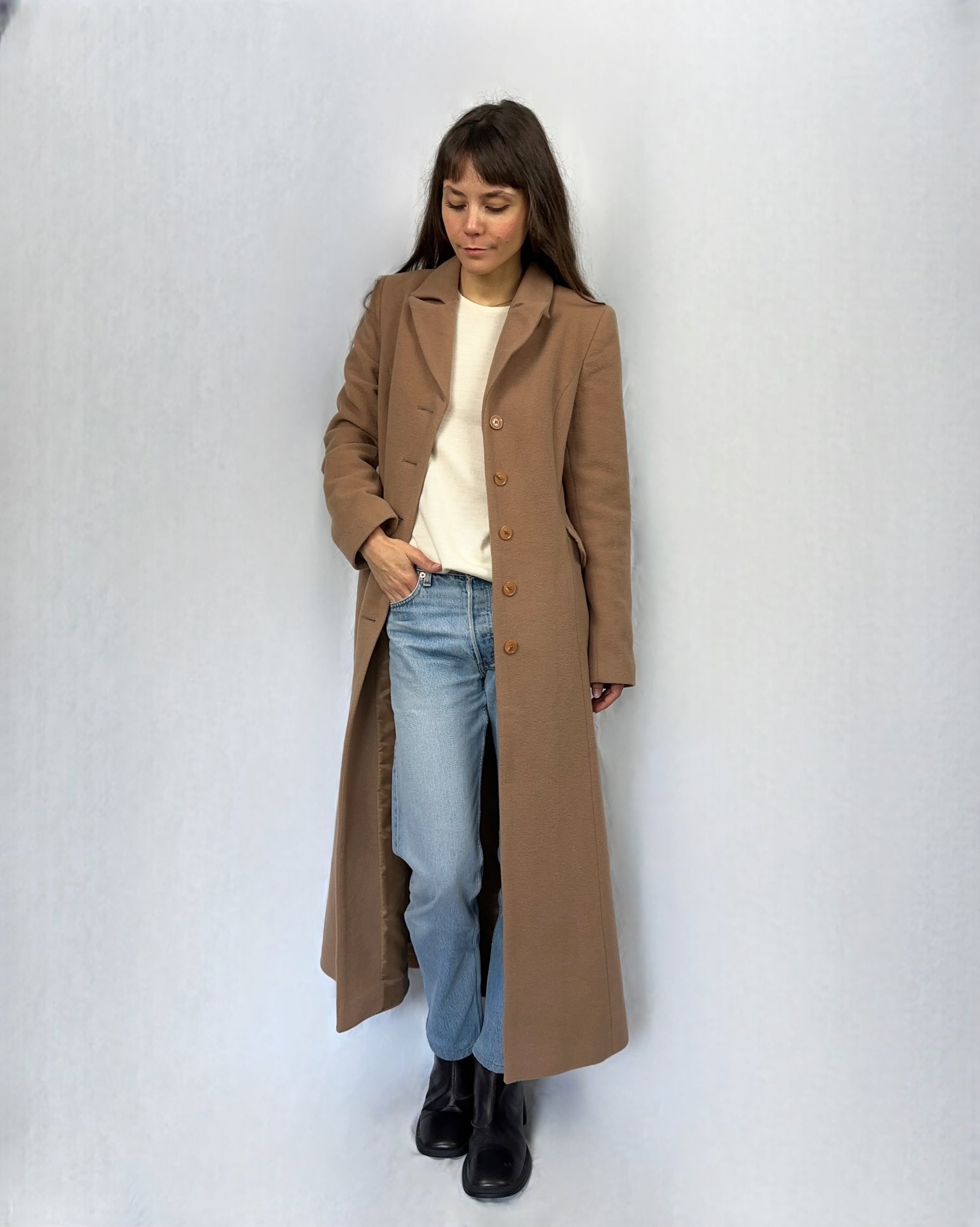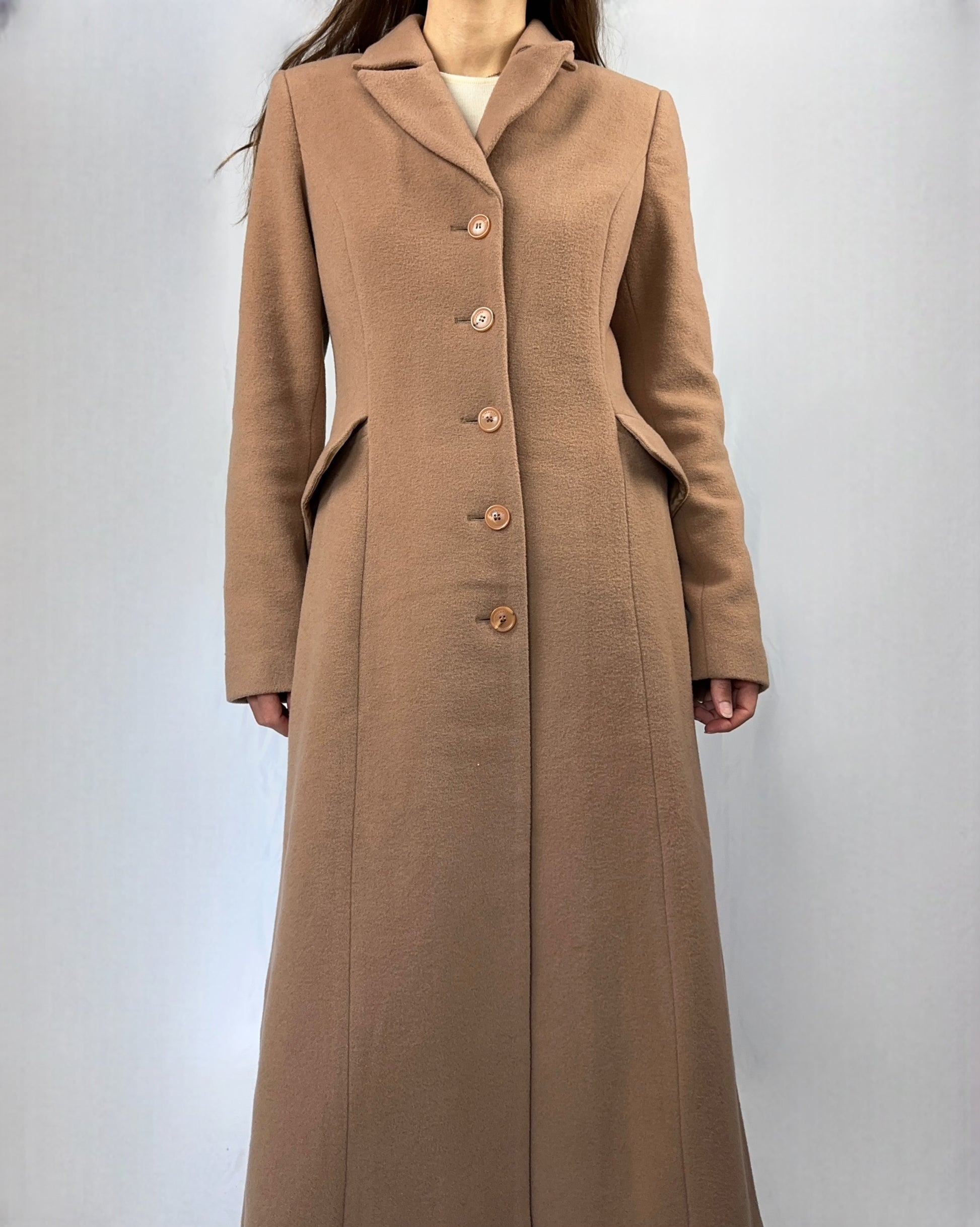 Elegante cappotto lungo beige, realizzato in un misto lana e cashmere. Il colore neutro e la linea leggermente svasata (più stretto in vita, diventa ampio verso il basso) lo rendono un capo versatile e raffinato, ideale per le stagioni più fredde. Il design minimalista e la qualità dei materiali garantiscono comfort e stile senza tempo.