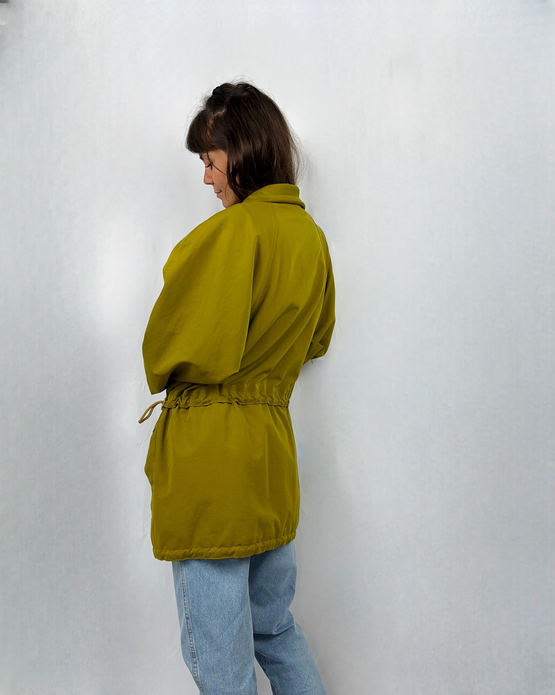 Giacca a vento color senape dal taglio sportivo e pratico, con cerniera e bottoni tono su tono. Il laccio elastico in vita permette di regolare la vestibilità e valorizzare la forma. Un capo funzionale, ideale per l’uso quotidiano.