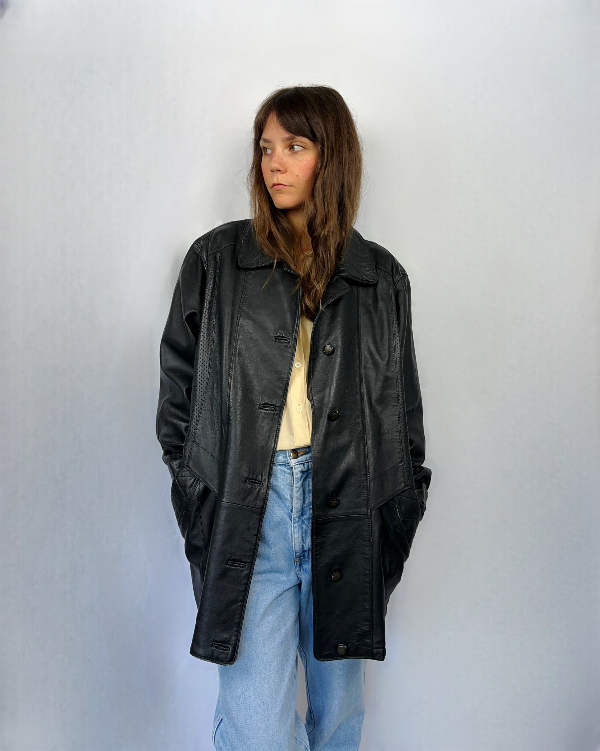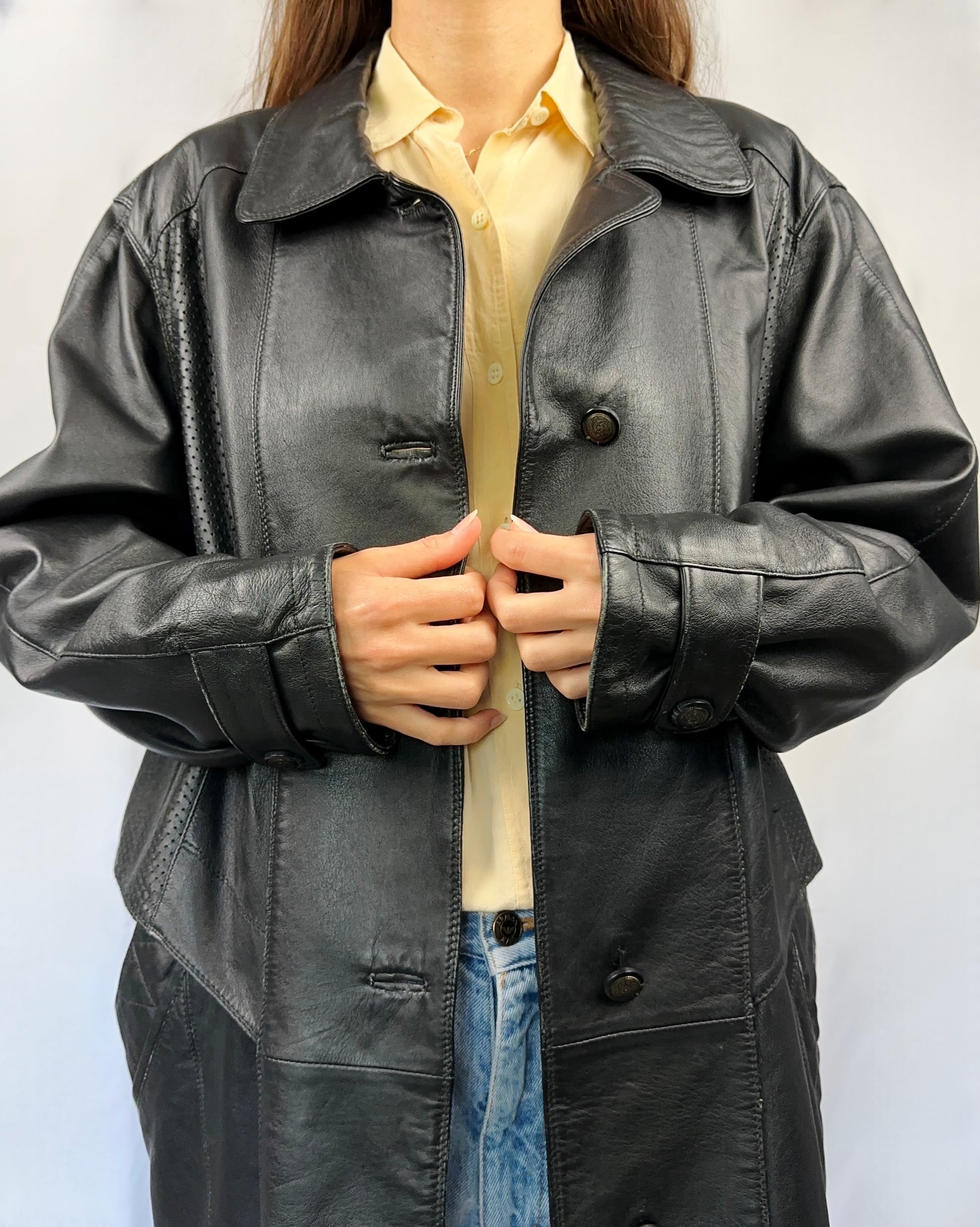 Un capo dallo stile deciso e ricercato, questa giacca nera in vera pelle si distingue per il suo design originale e ricco di dettagli. La particolarità è la mantellina sovrapposta, integrata nella struttura della giacca, che avvolge la parte superiore della schiena e i lati con una raffinata fantasia a buchini traforati. Un gioco di pieni e vuoti che dona leggerezza visiva alla pelle e aggiunge un tocco grafico e moderno.