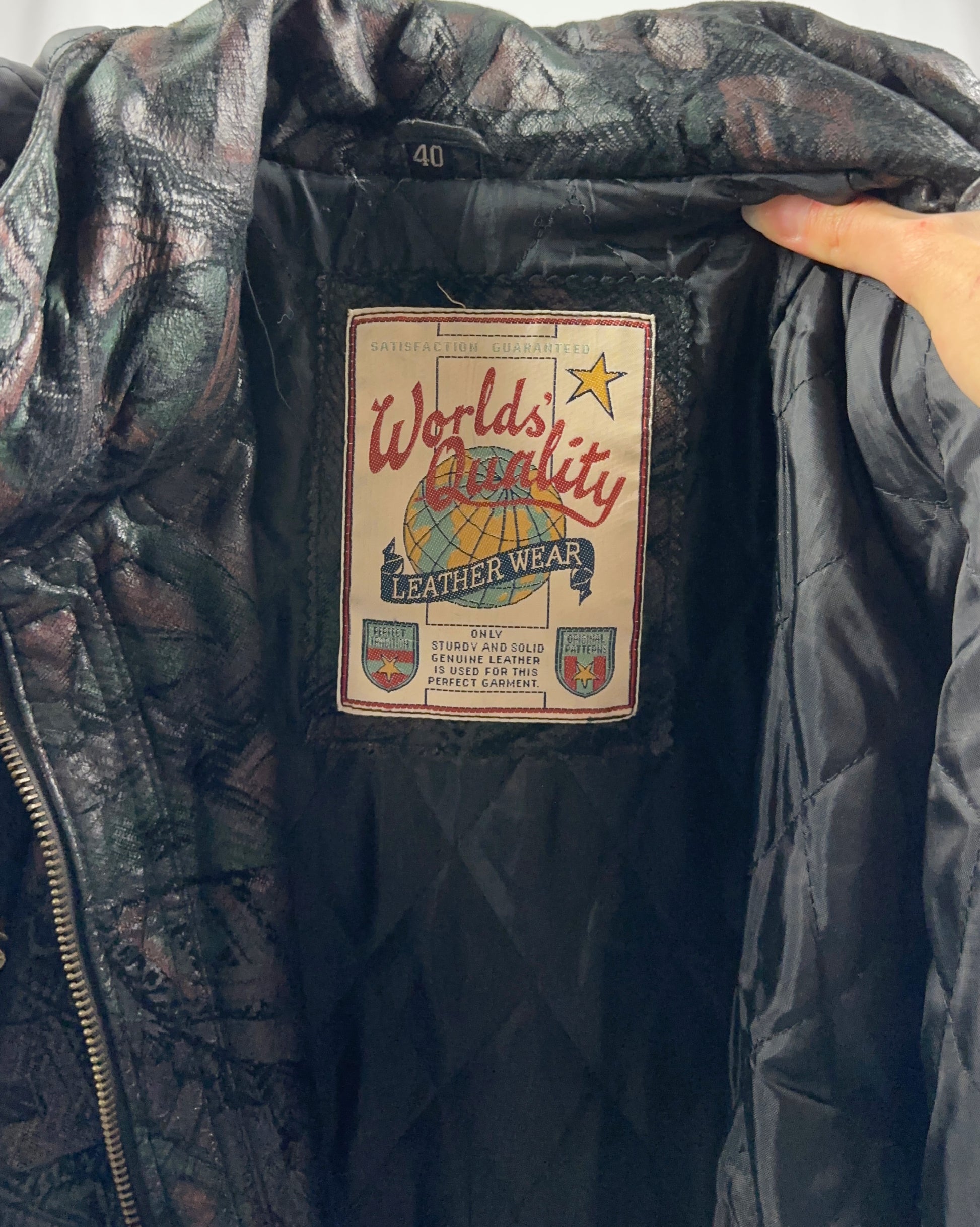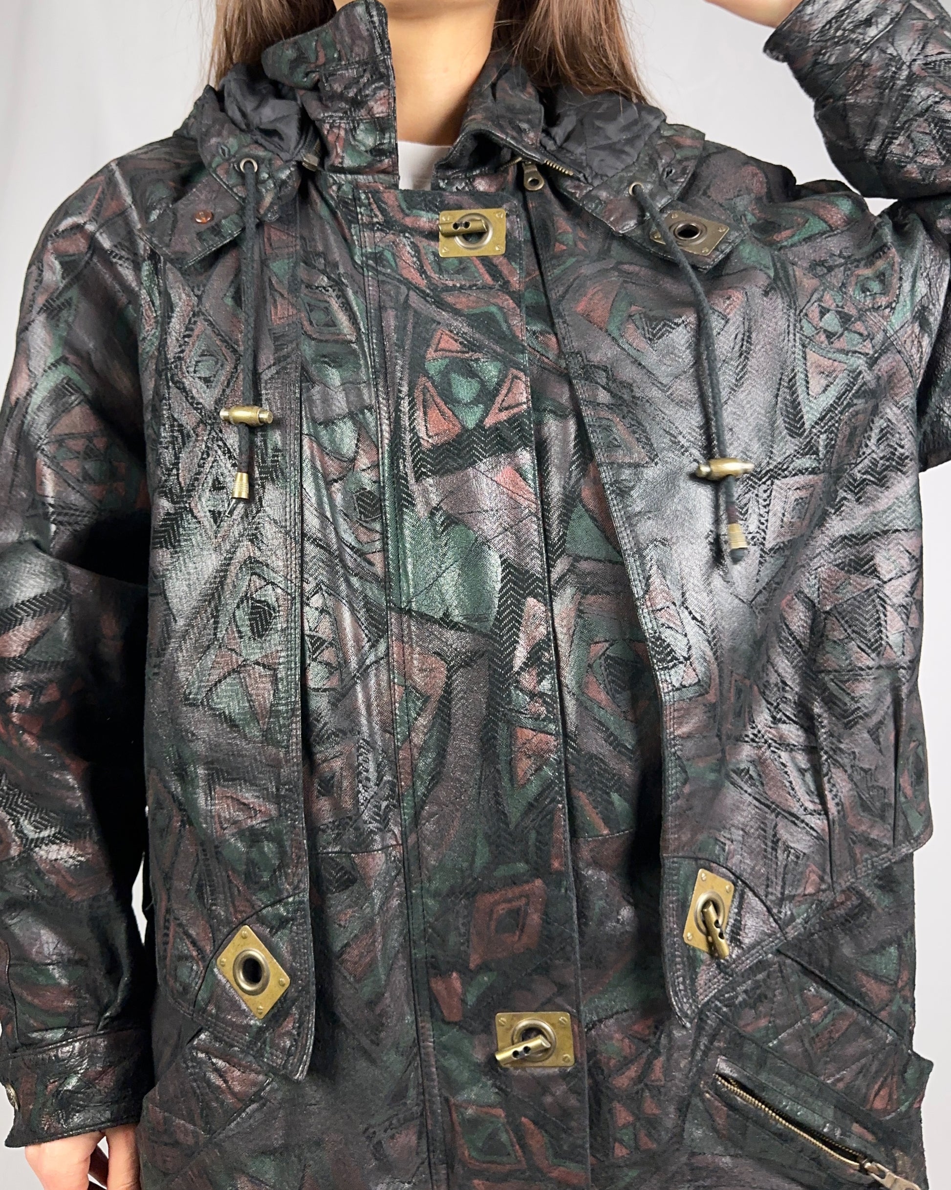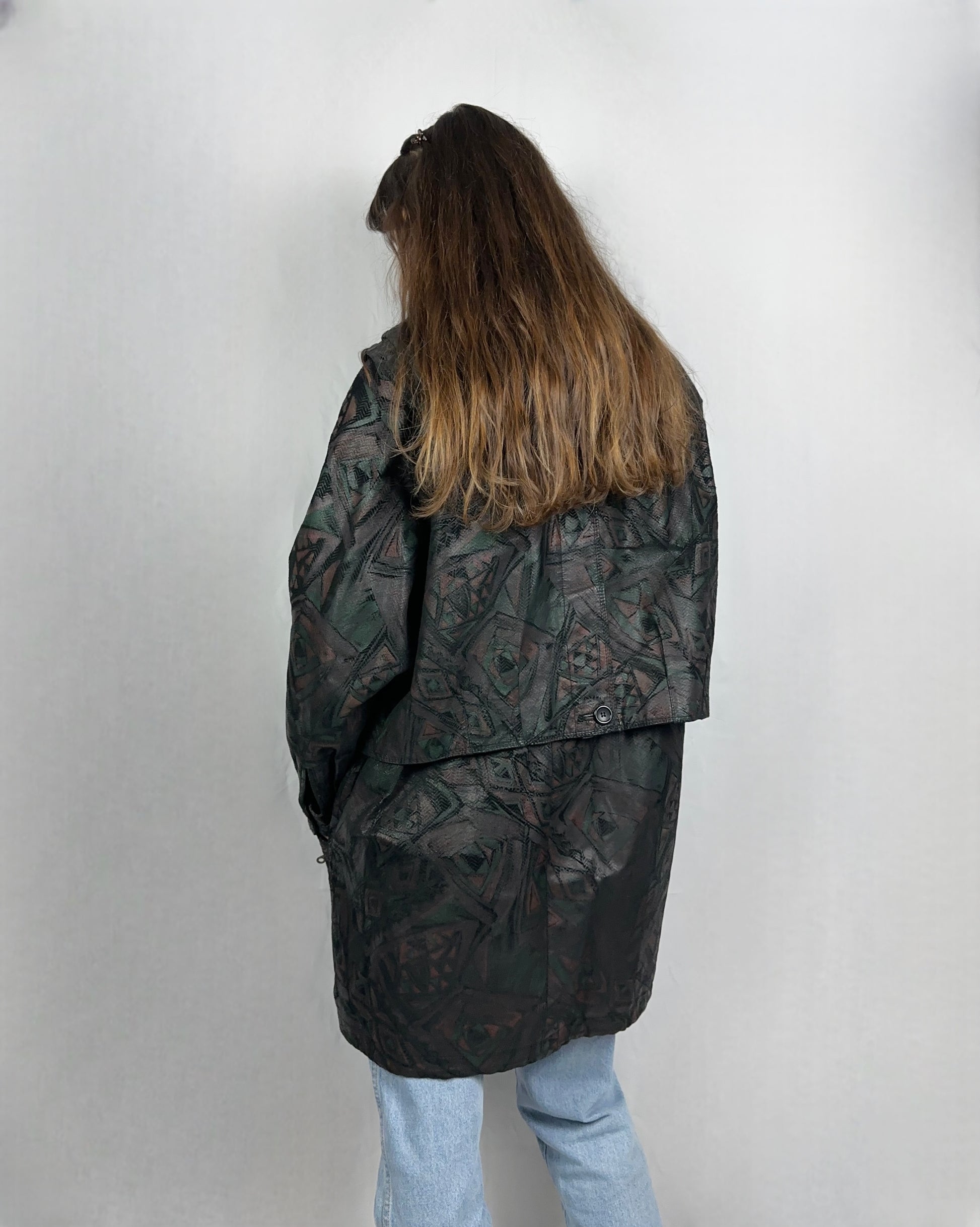 Giaccone in vera pelle con motivi astratti. Il design geometrico e moderno si distingue per originalità, mentre la qualità della pelle garantisce durabilità e comfort nel tempo.