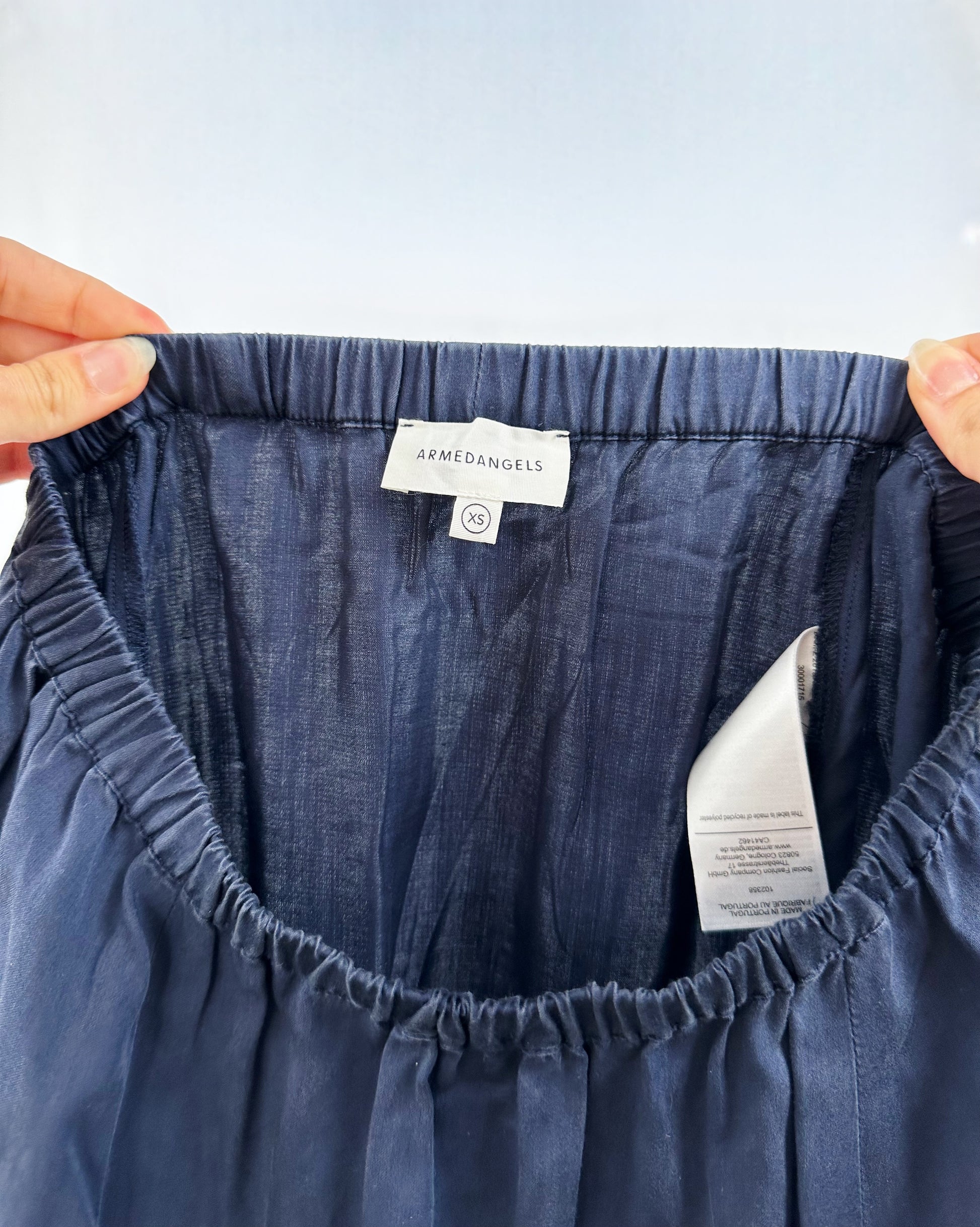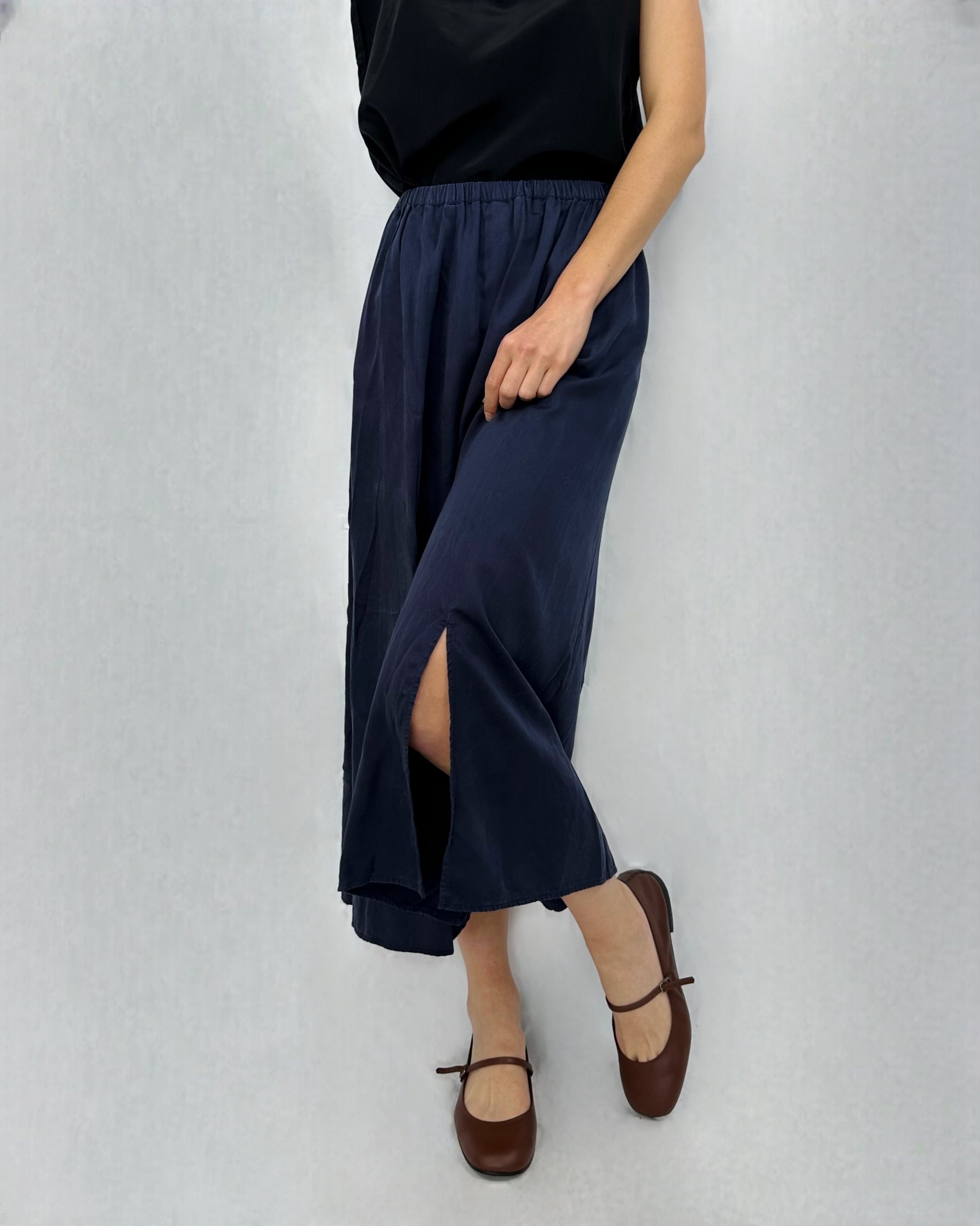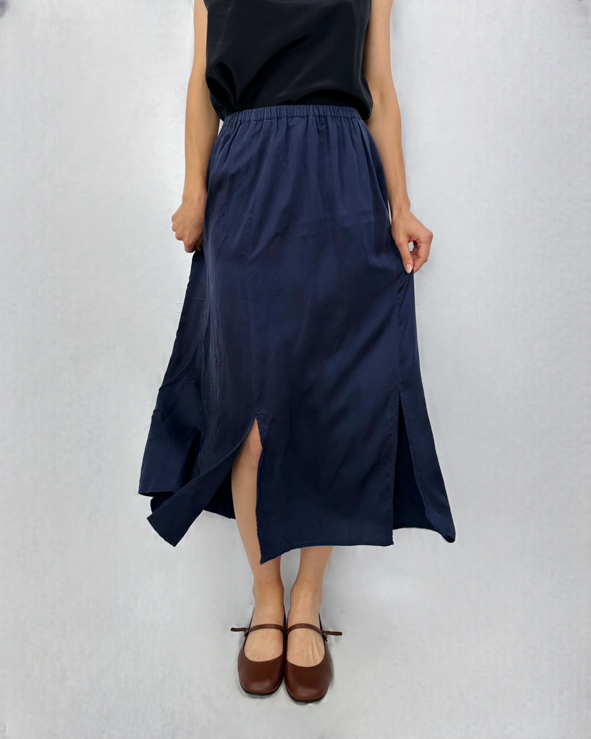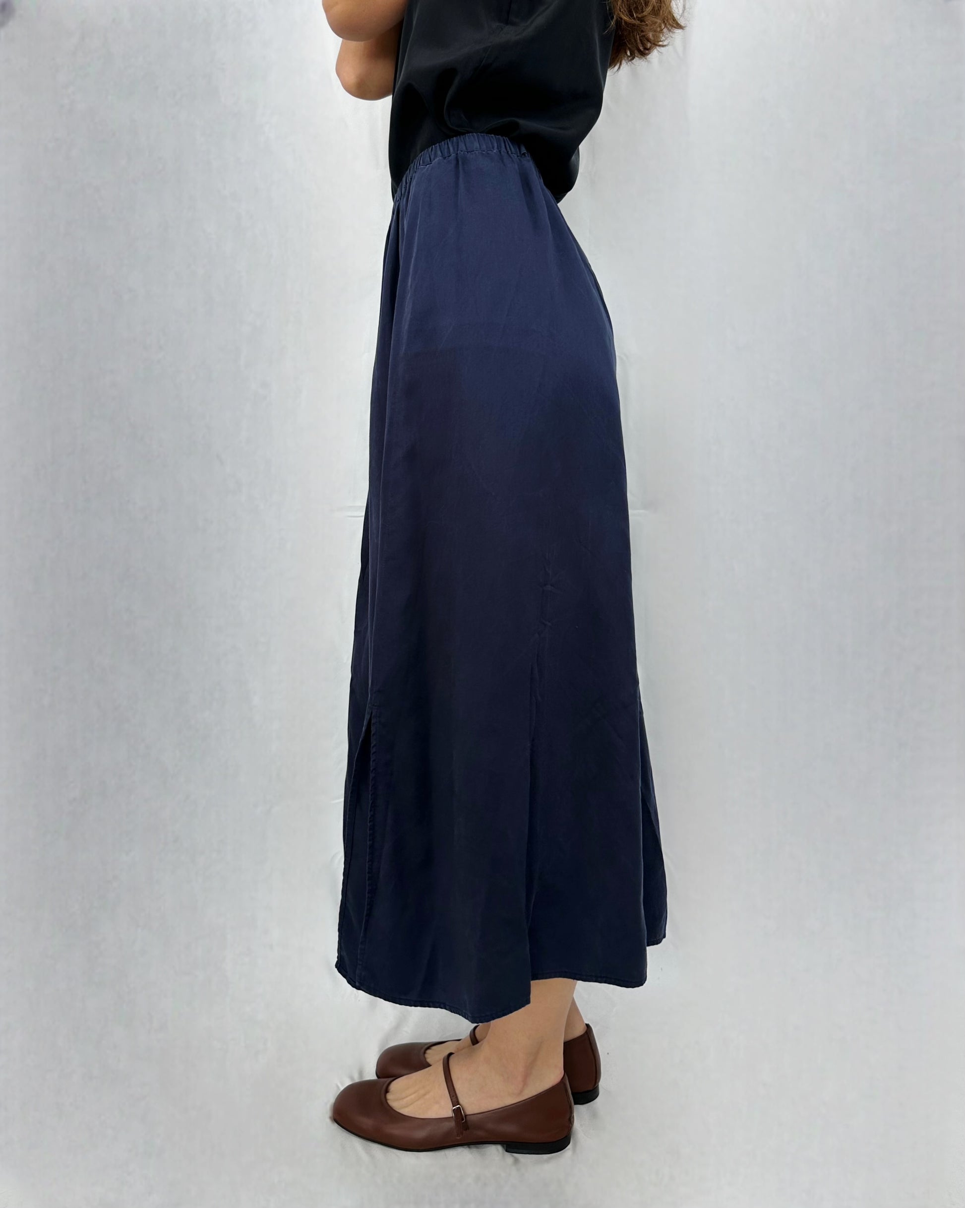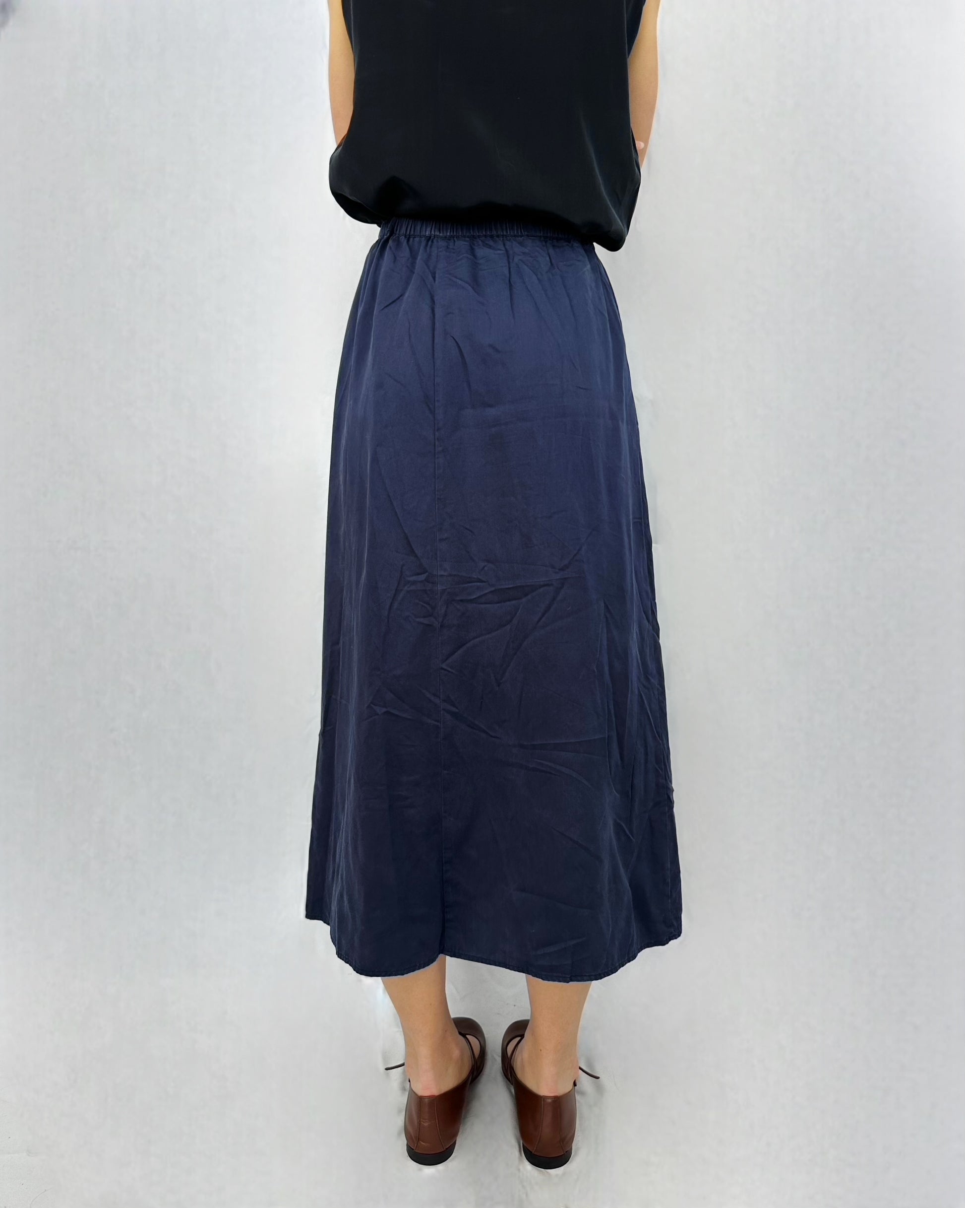 Gonna lunga in Tencel blu, dal taglio svasato e fluido, perfetta per un look comodo e raffinato. Il tessuto, morbido, traspirante e setoso al tatto, cade con eleganza seguendo i movimenti del corpo, mentre la tonalità blu aggiunge profondità e versatilità. La linea svasata dona leggerezza, rendendola ideale per la mezza stagione o l’estate.