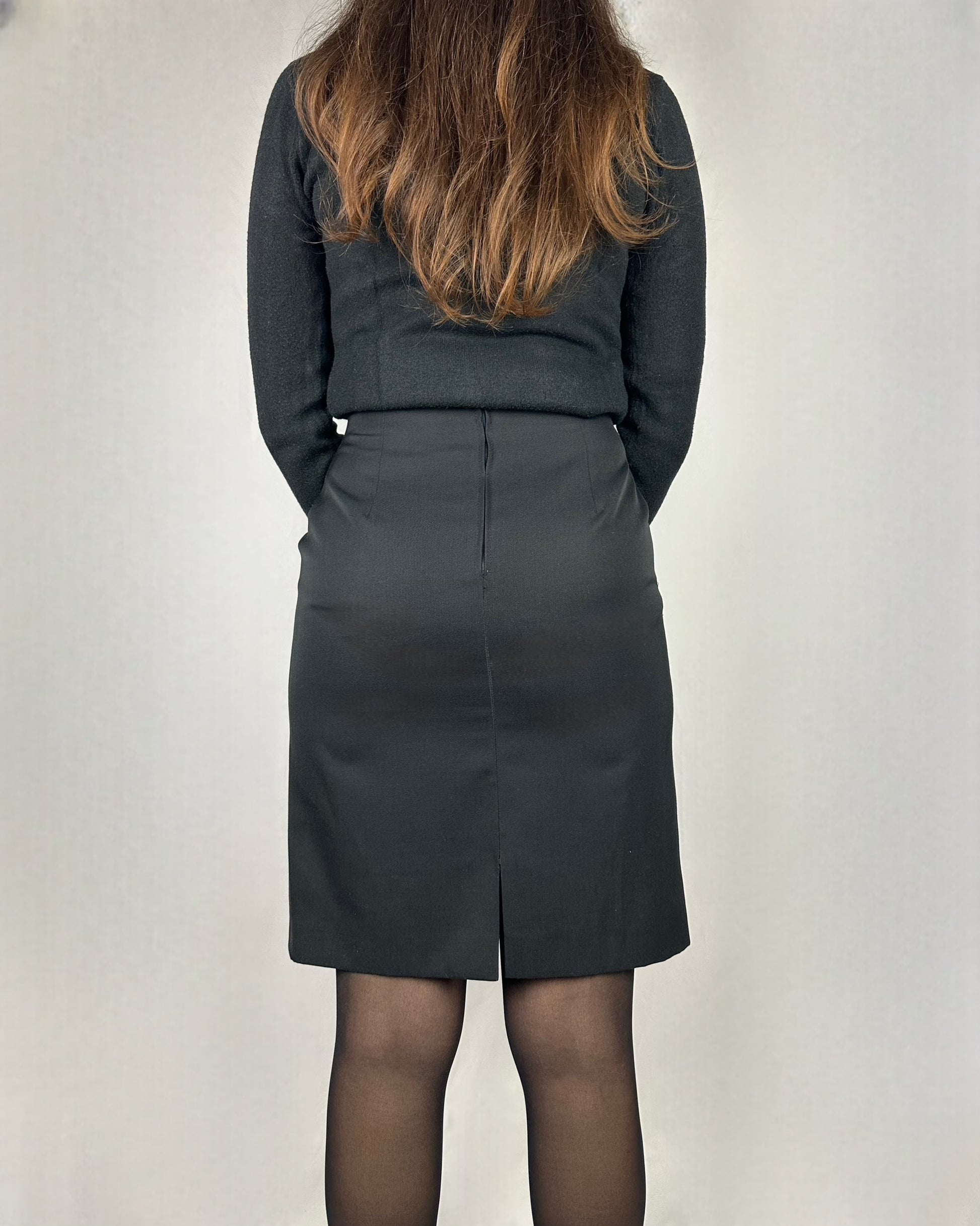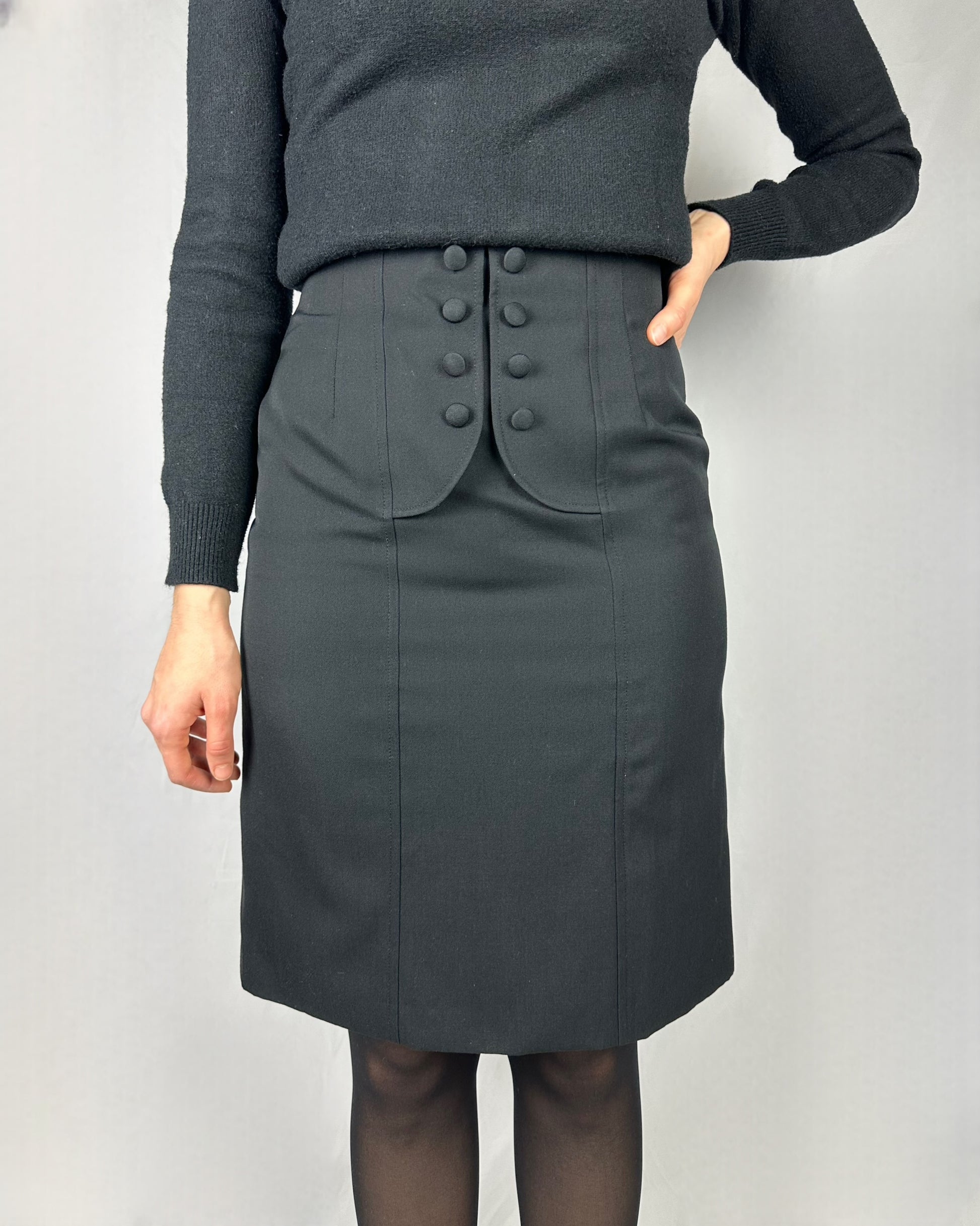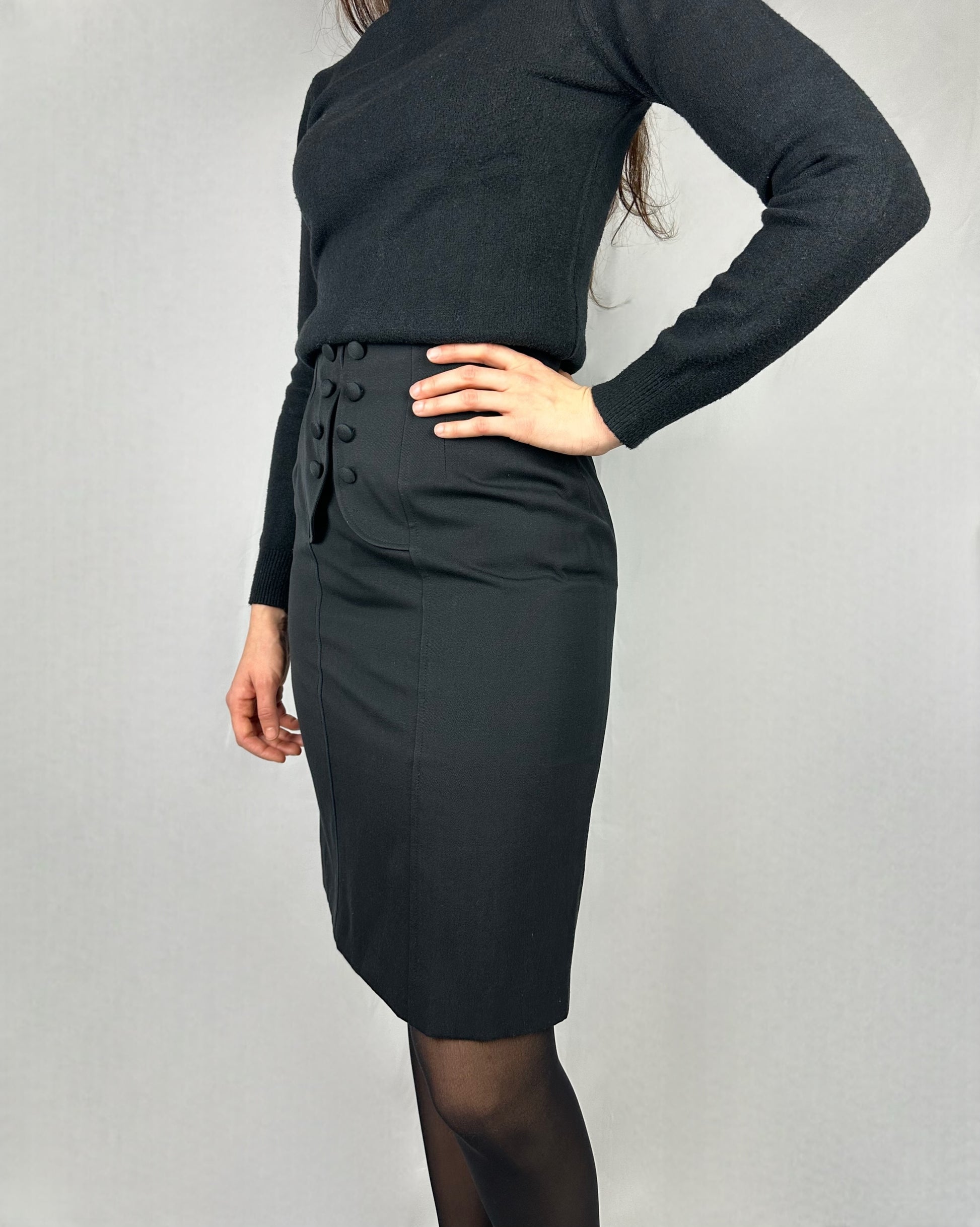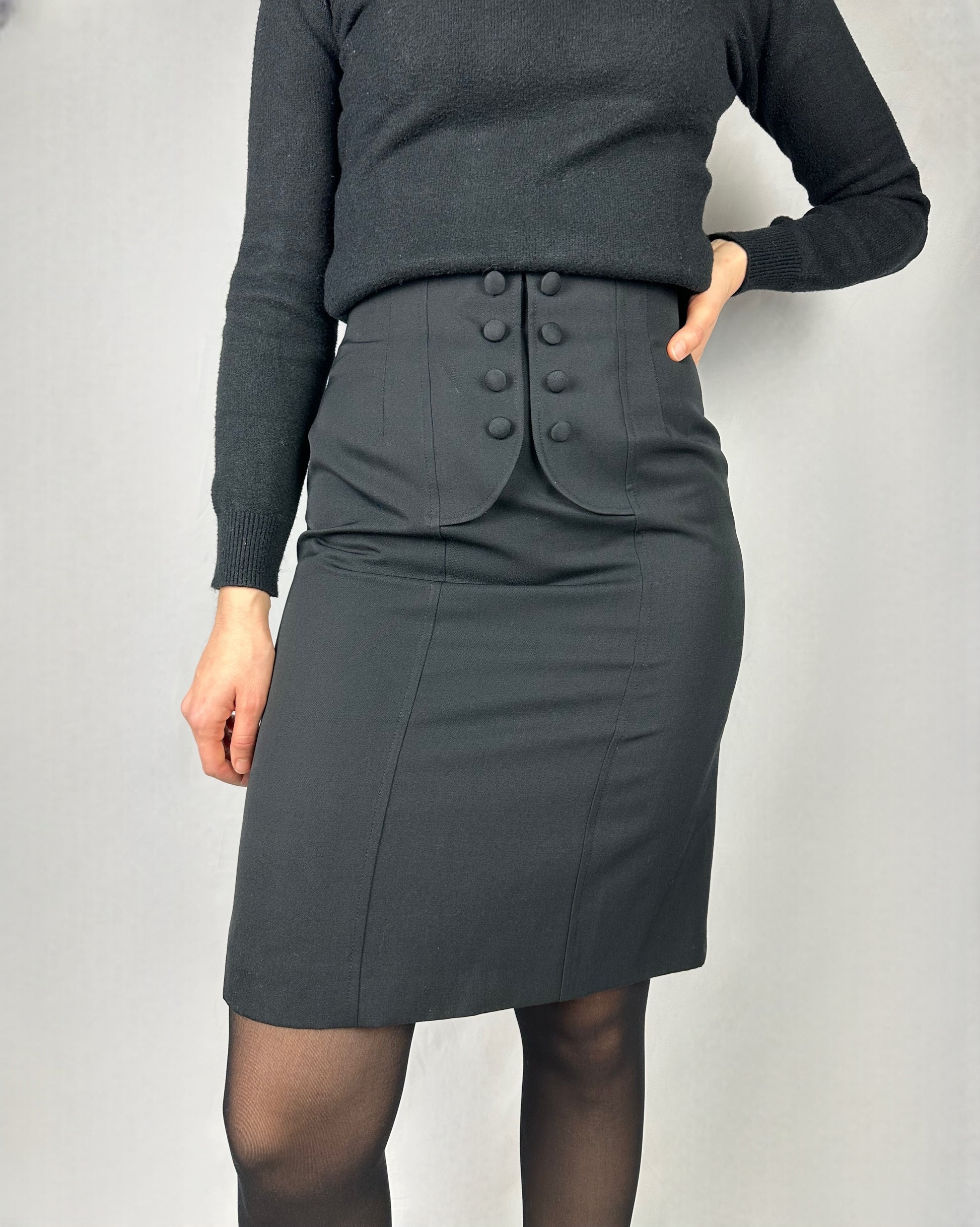 Gonna nera in misto lana con sulla vita sei bottoni disposti su due file, che rendono il tutto particolare. Lunghezza che arriva sopra il ginocchio, perfetta per uno stile classico e versatile. Un capo essenziale della moda vintage che si abbina facilmente a qualsiasi guardaroba, garantendo comfort e eleganza senza tempo.