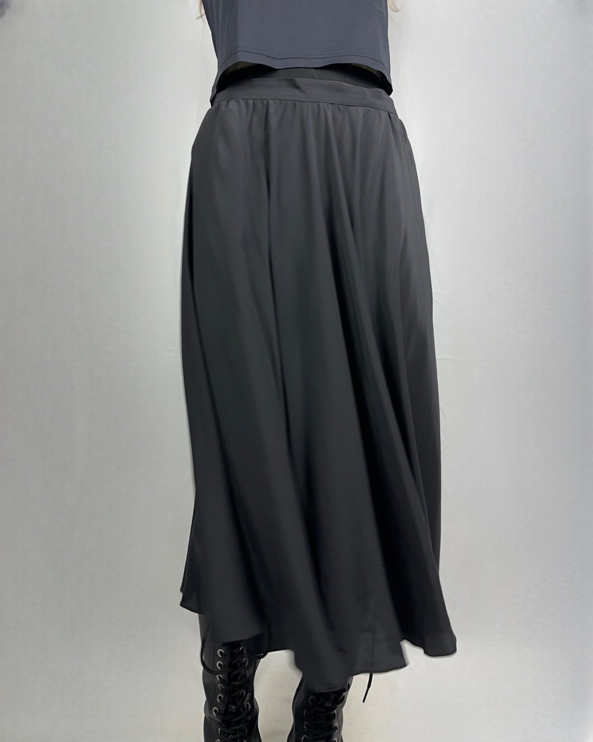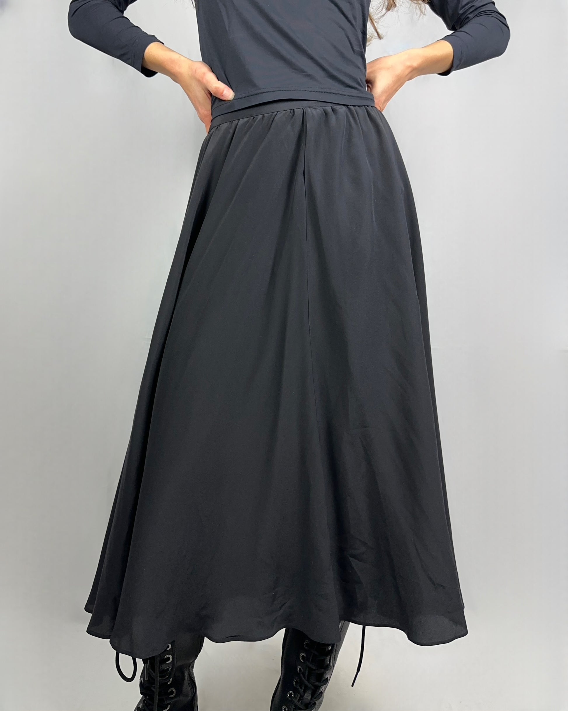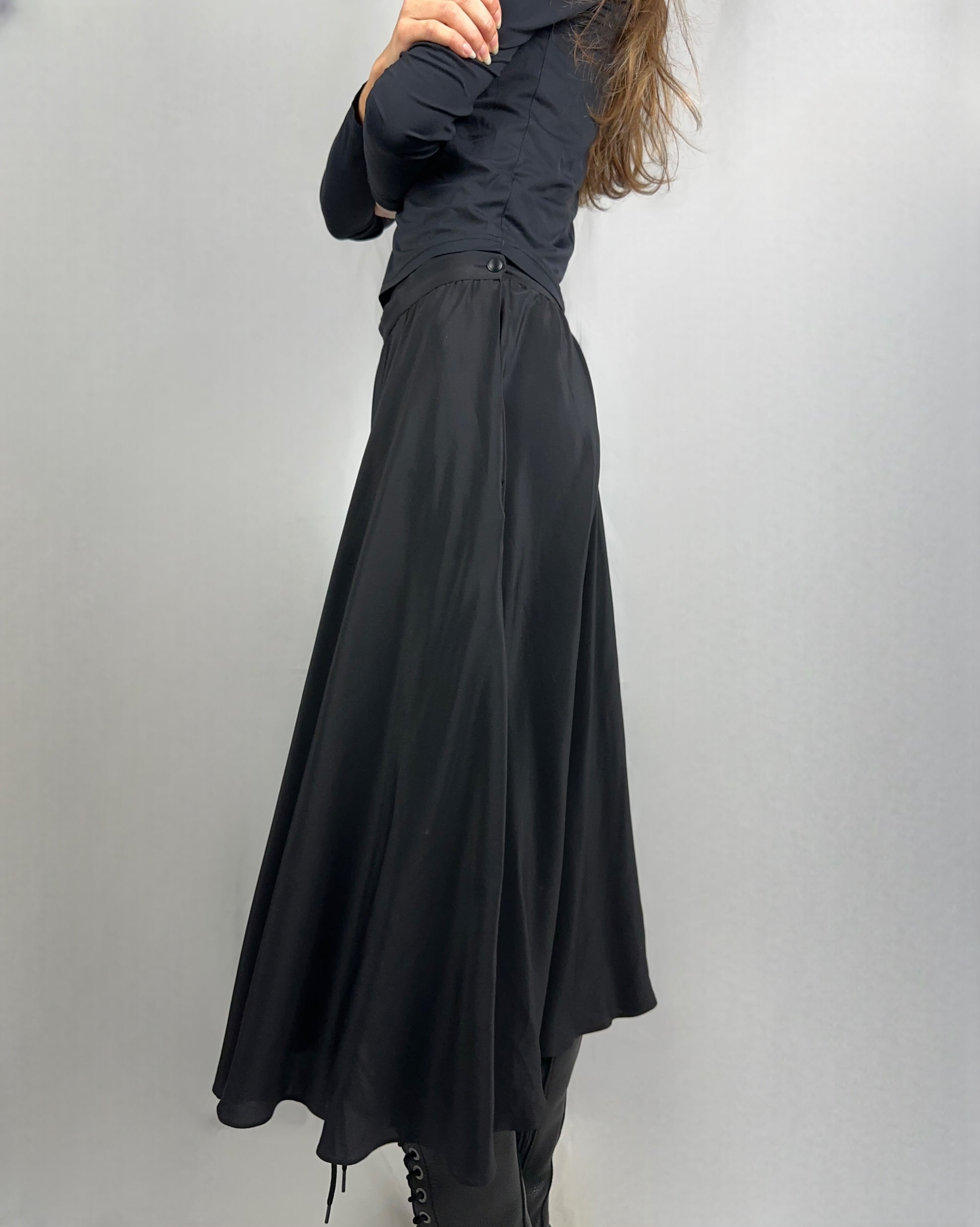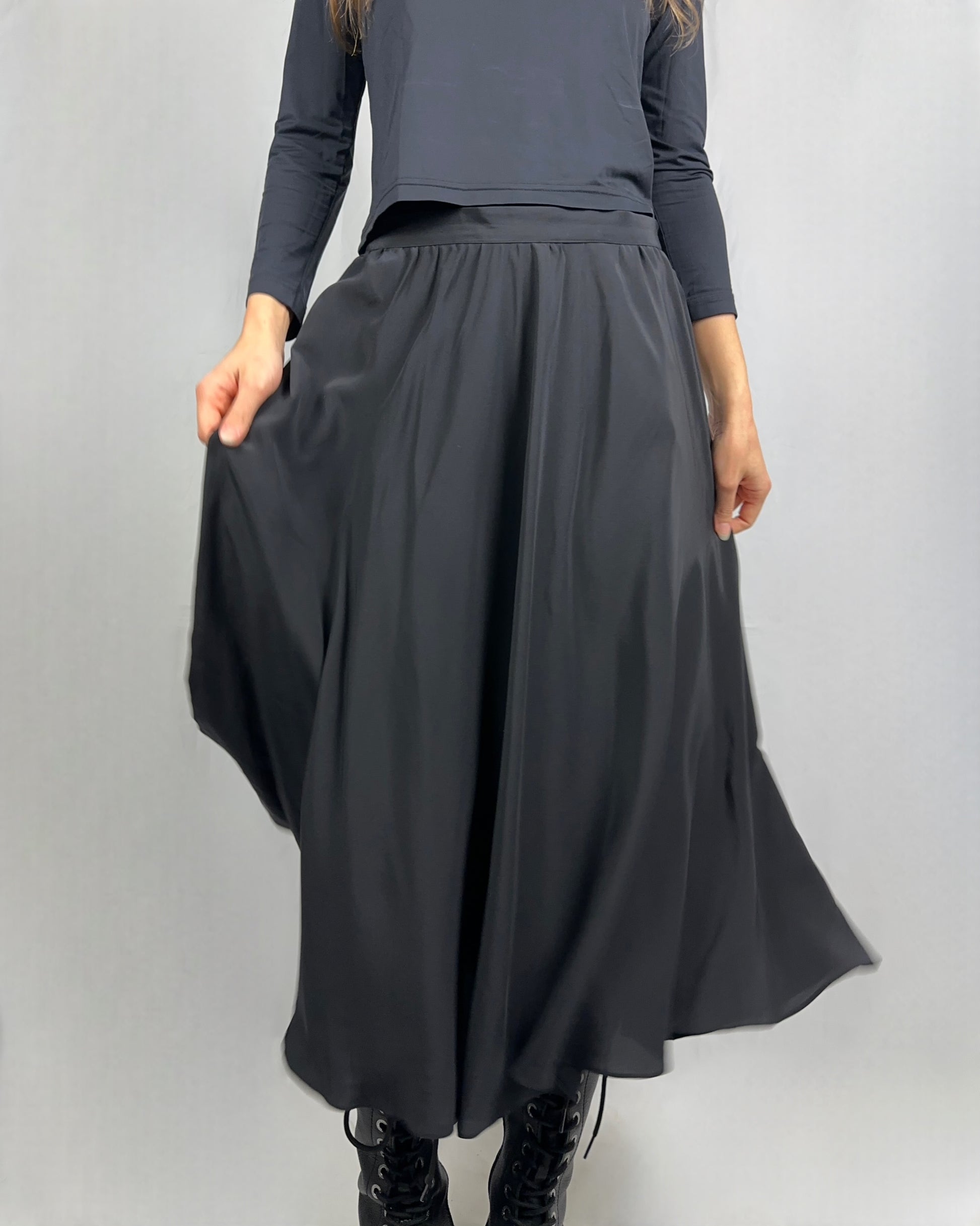 Gonna lunga in pura seta nera, un capo senza tempo che incarna eleganza e raffinatezza. La seta naturale garantisce una caduta fluida e morbida, con una lucentezza delicata. Perfetta per occasioni formali o per elevare uno stile quotidiano con sofisticatezza. Il colore nero intenso si abbina facilmente a qualsiasi guardaroba, mentre la qualità della fibra assicura comfort e traspirabilità.