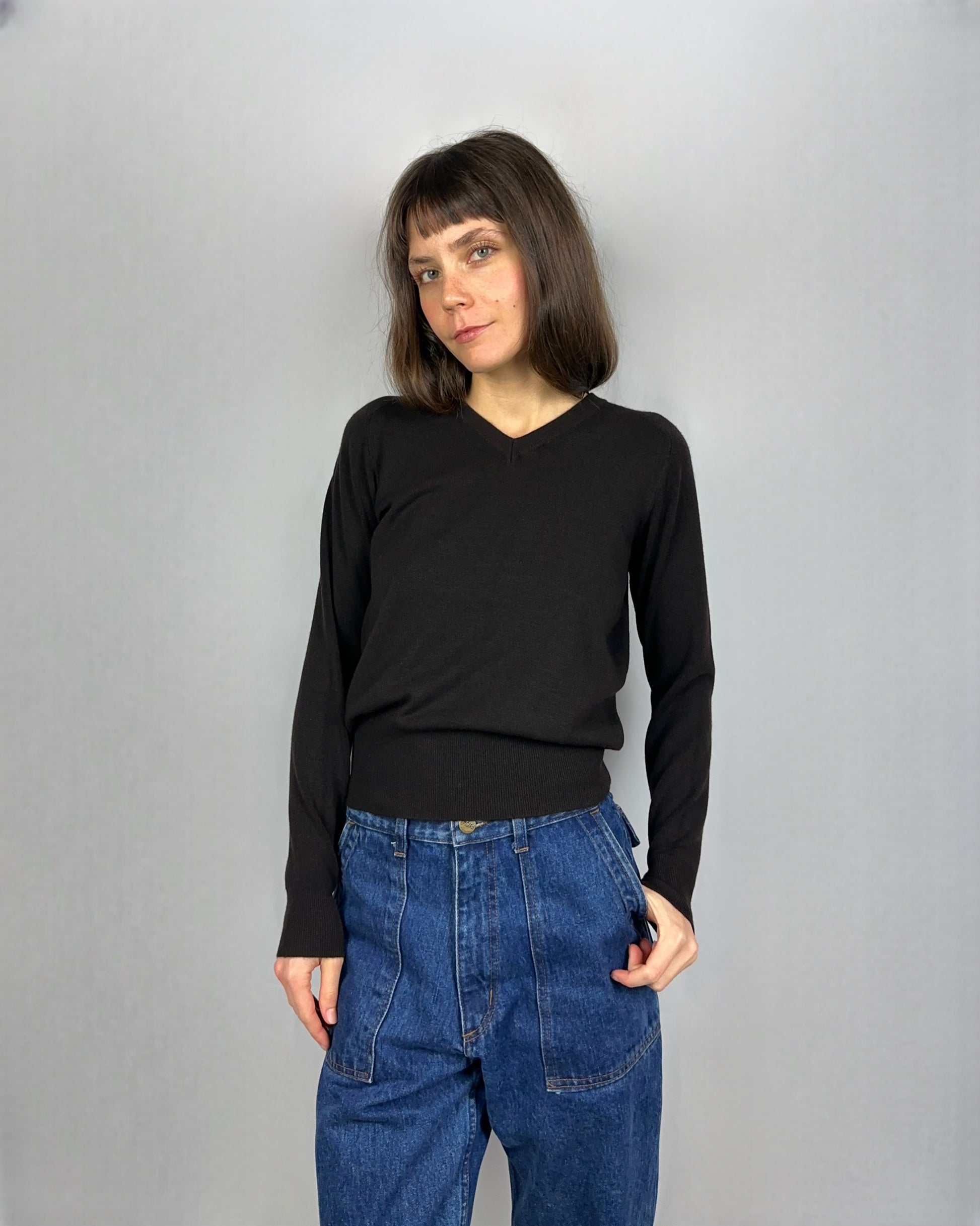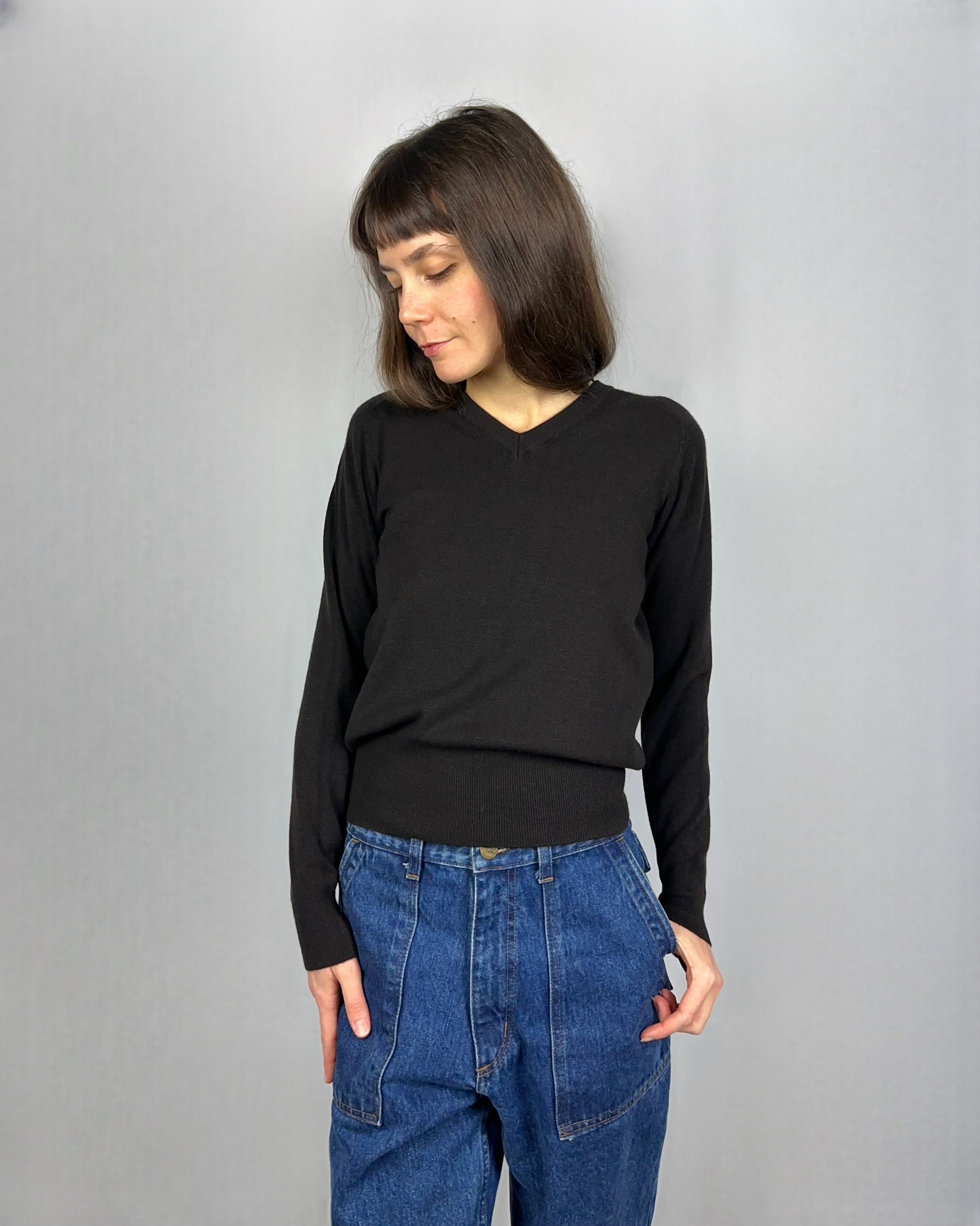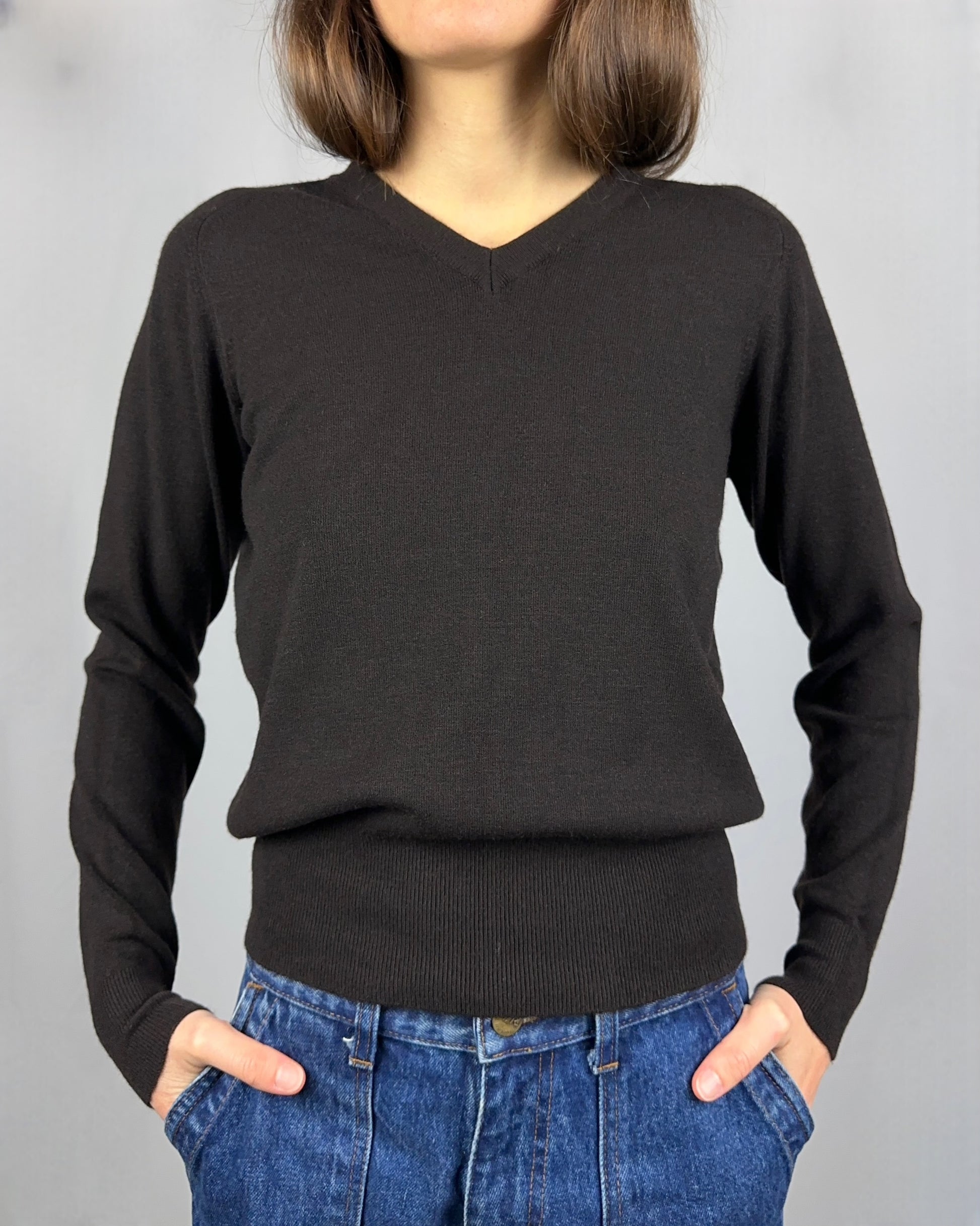 Maglioncino morbido ed elasticizzato, dalla tonalità marrone cioccolato. Lo scollo a V affusolato regala eleganza e versatilità, perfetto per stratificare o indossare da solo. Comodo e facile da indossare ogni giorno.