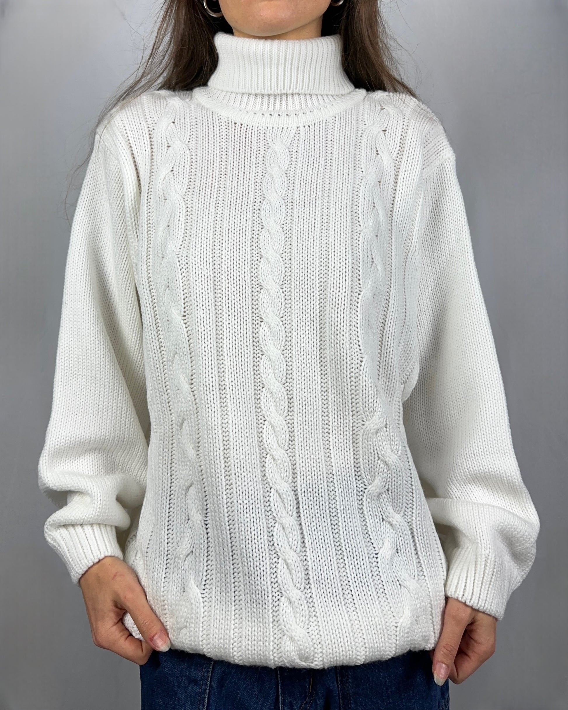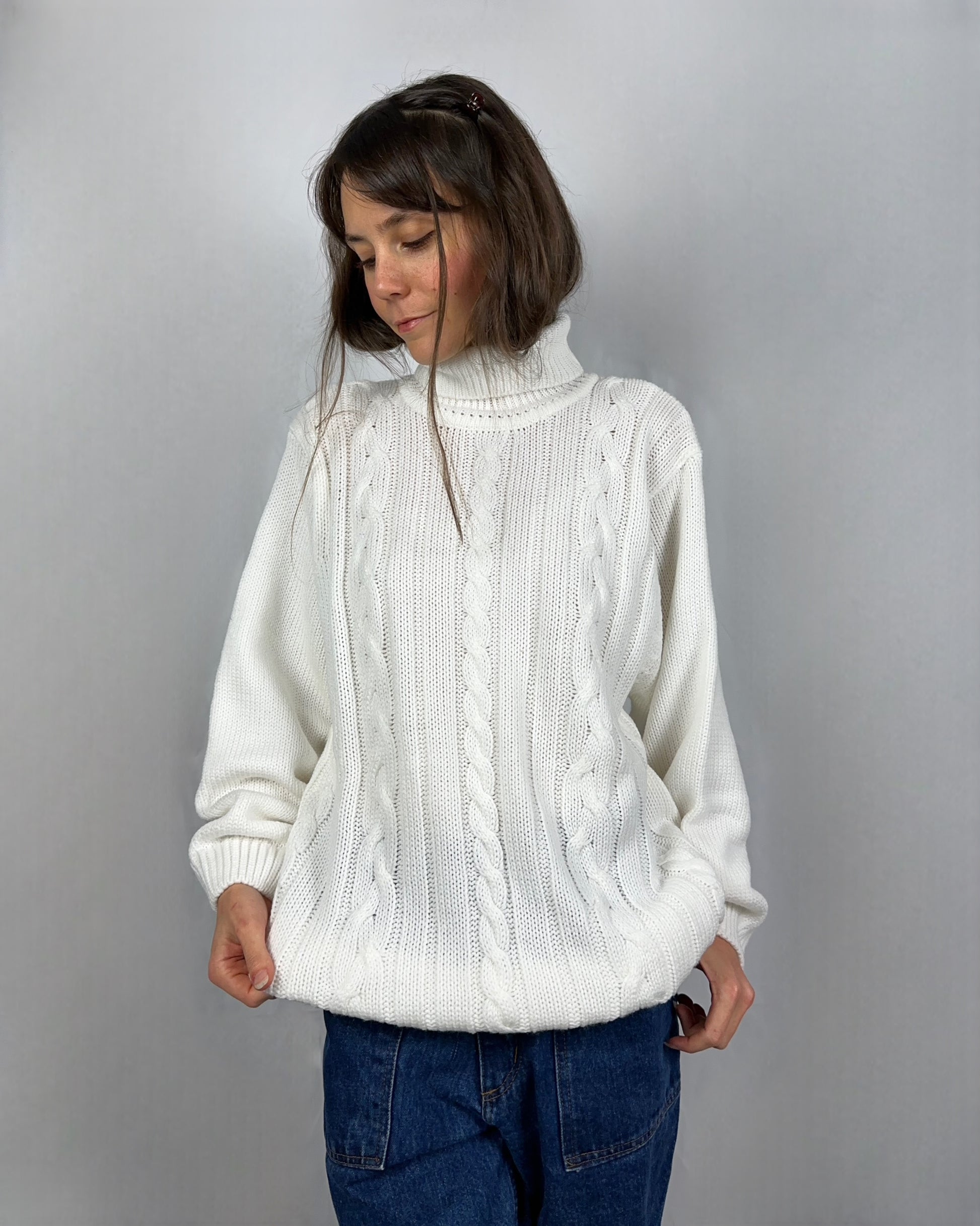 Maglione dolcevita con elegante motivo intrecciato. La trama strutturata conferisce profondità e movimento al capo, mentre il collo alto garantisce calore e protezione. La tonalità bianca lo rende versatile e facile da abbinare con qualsiasi guardaroba. Un pezzo essenziale che unisce comfort e stile senza tempo.