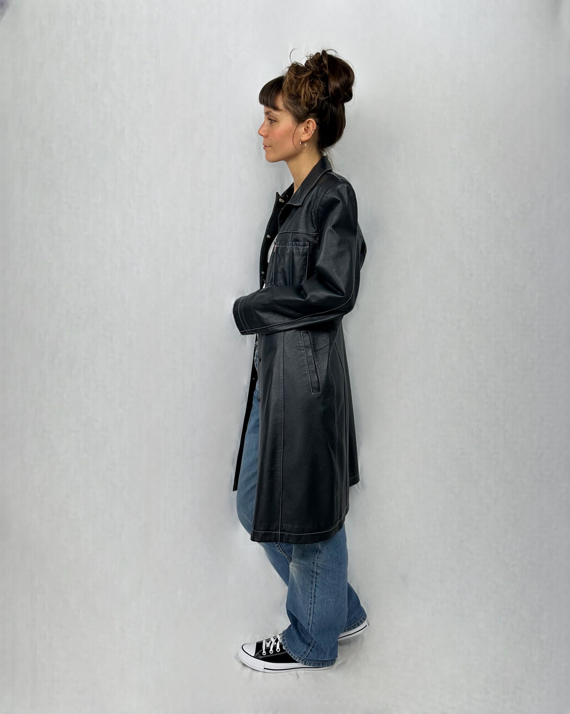 Questo trench blu scuro in vera pelle è un capo elegante e sofisticato, valorizzato dalle cuciture a contrasto bianche che ne evidenziano la struttura. Il taglio classico garantisce una vestibilità comoda e raffinata. Il tessuto in pelle di alta qualità conferisce lucentezza, resistenza e un fascino senza tempo.