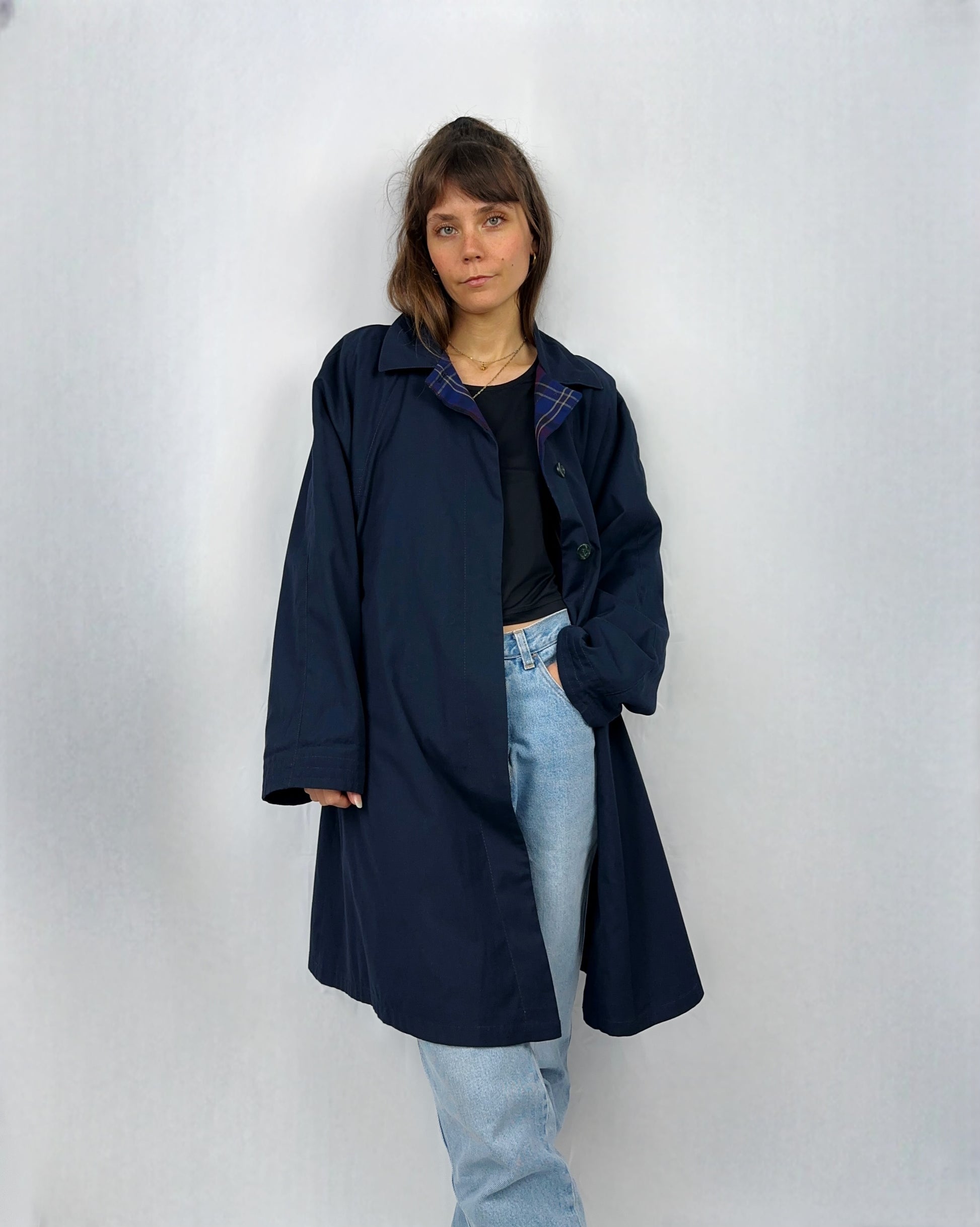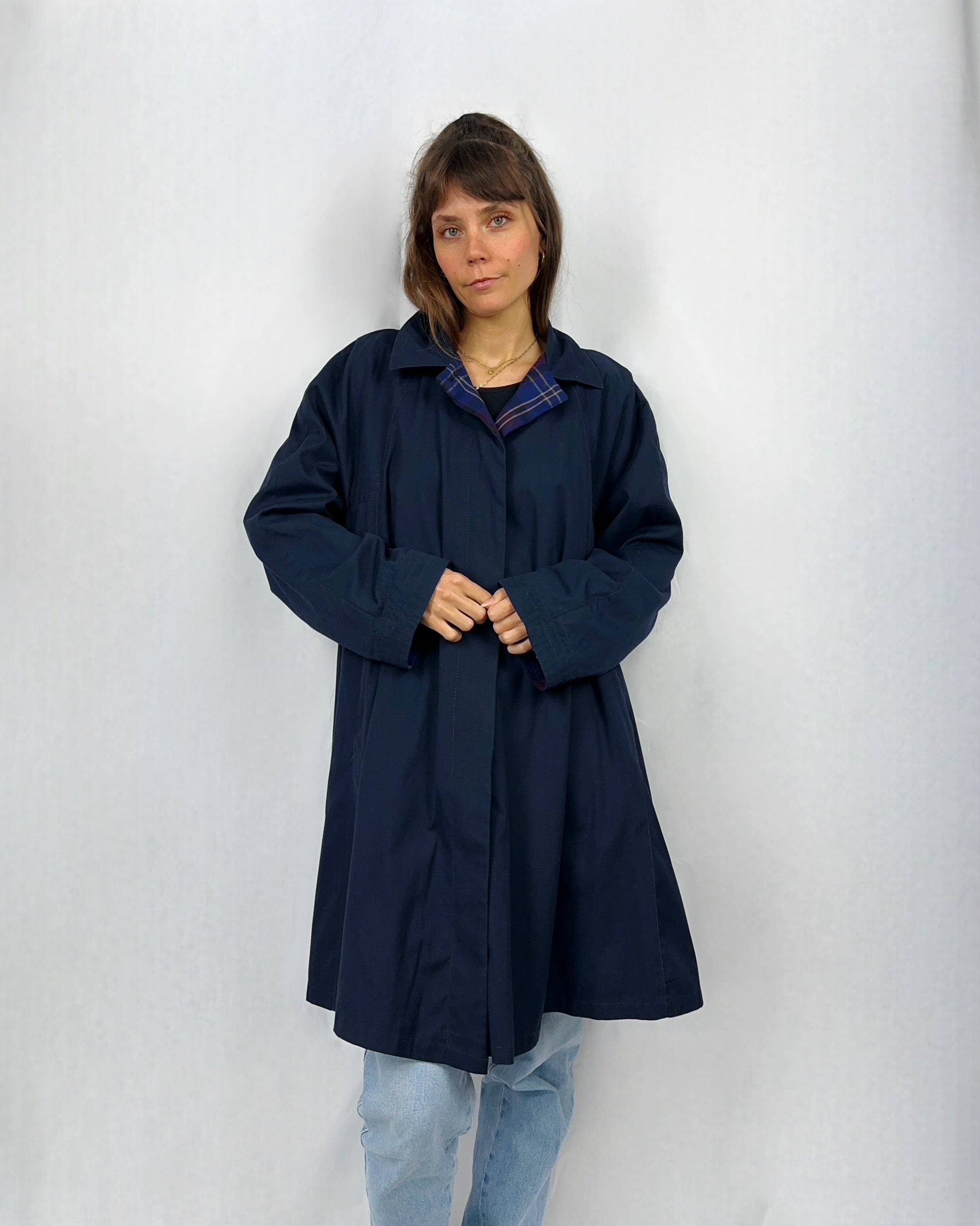 Trench corto blu dal taglio ampio e svasato, morbido e confortevole. Tessuto fluido che rende il capo facile da indossare. Design semplice e versatile, perfetto per ogni occasione.