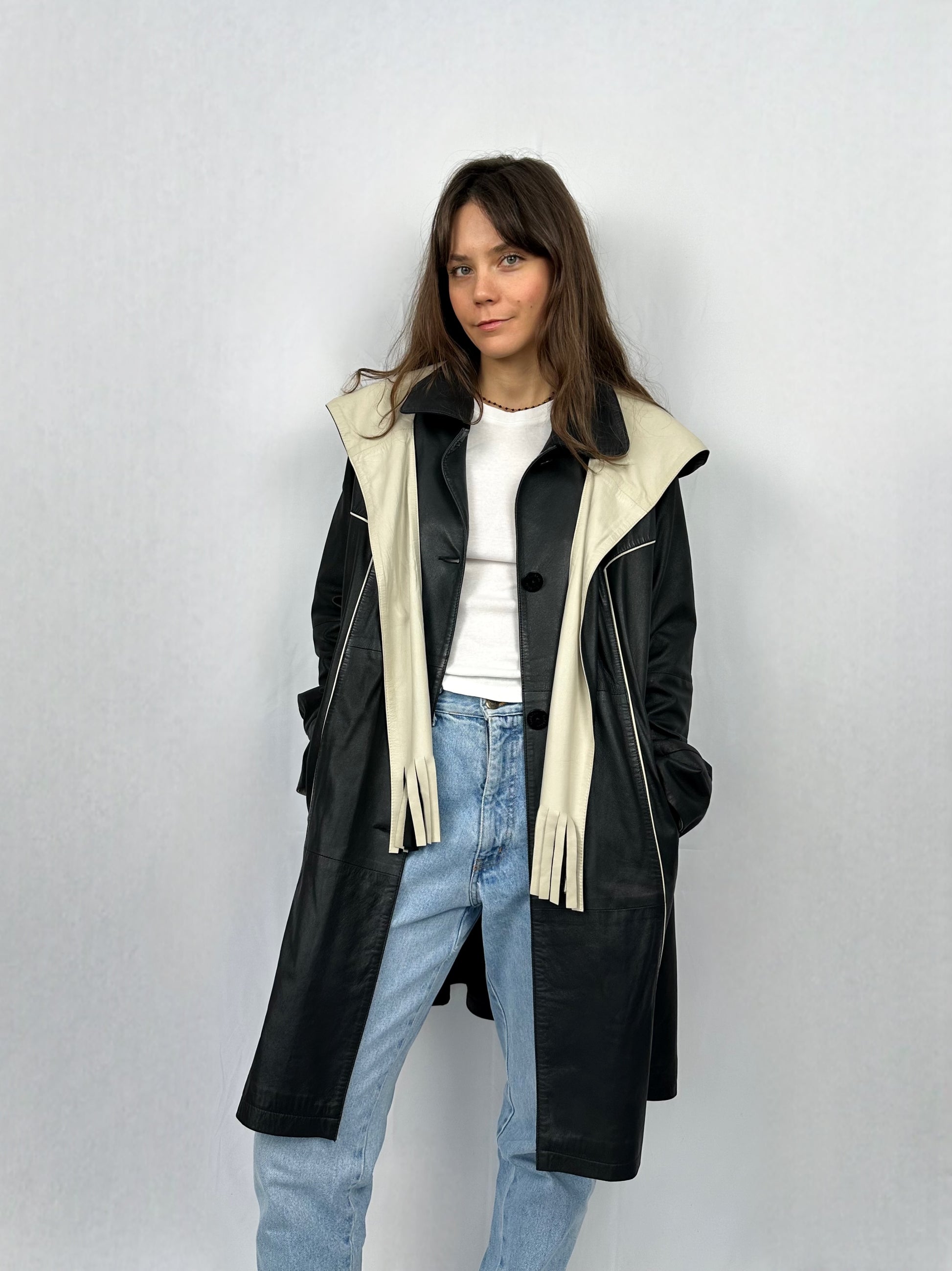 Questo trench nero in vera pelle del brand Cool & Calm è il capo perfetto per chi cerca bellezza e funzionalità in un unico pezzo. Il trench presenta una tonalità nera intensa, che si abbina facilmente a qualsiasi look, mentre l'interno bianco panna crea un contrasto particolare. Il cappuccio removibile offre versatilità, permettendo di adattare il capo alle diverse esigenze climatiche e stilistiche.