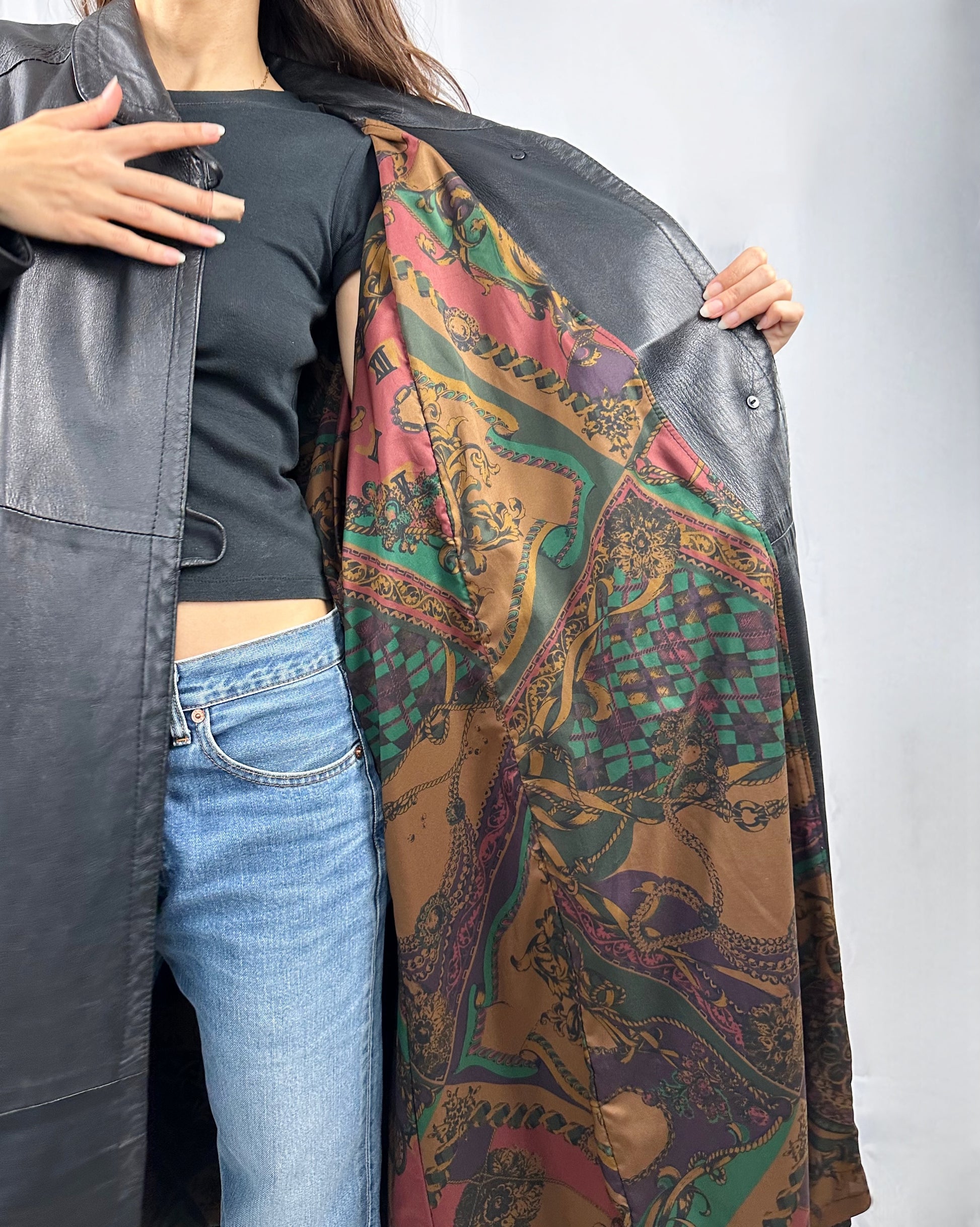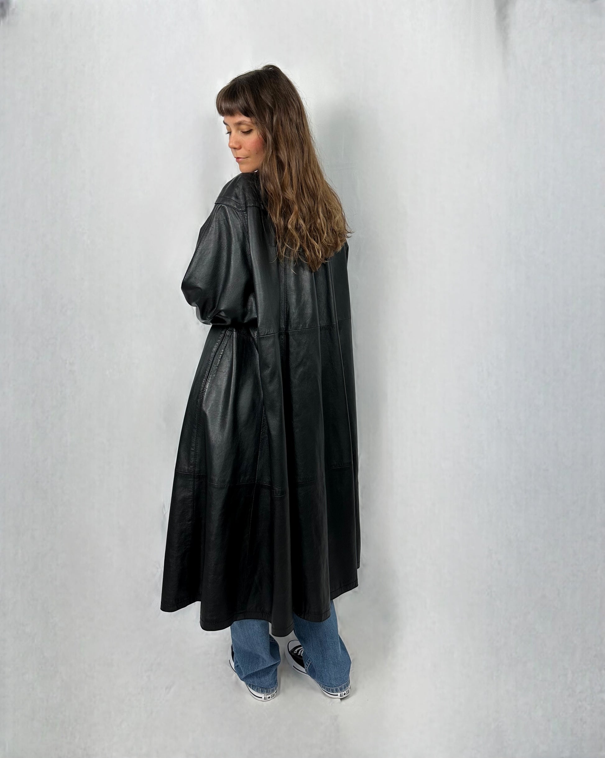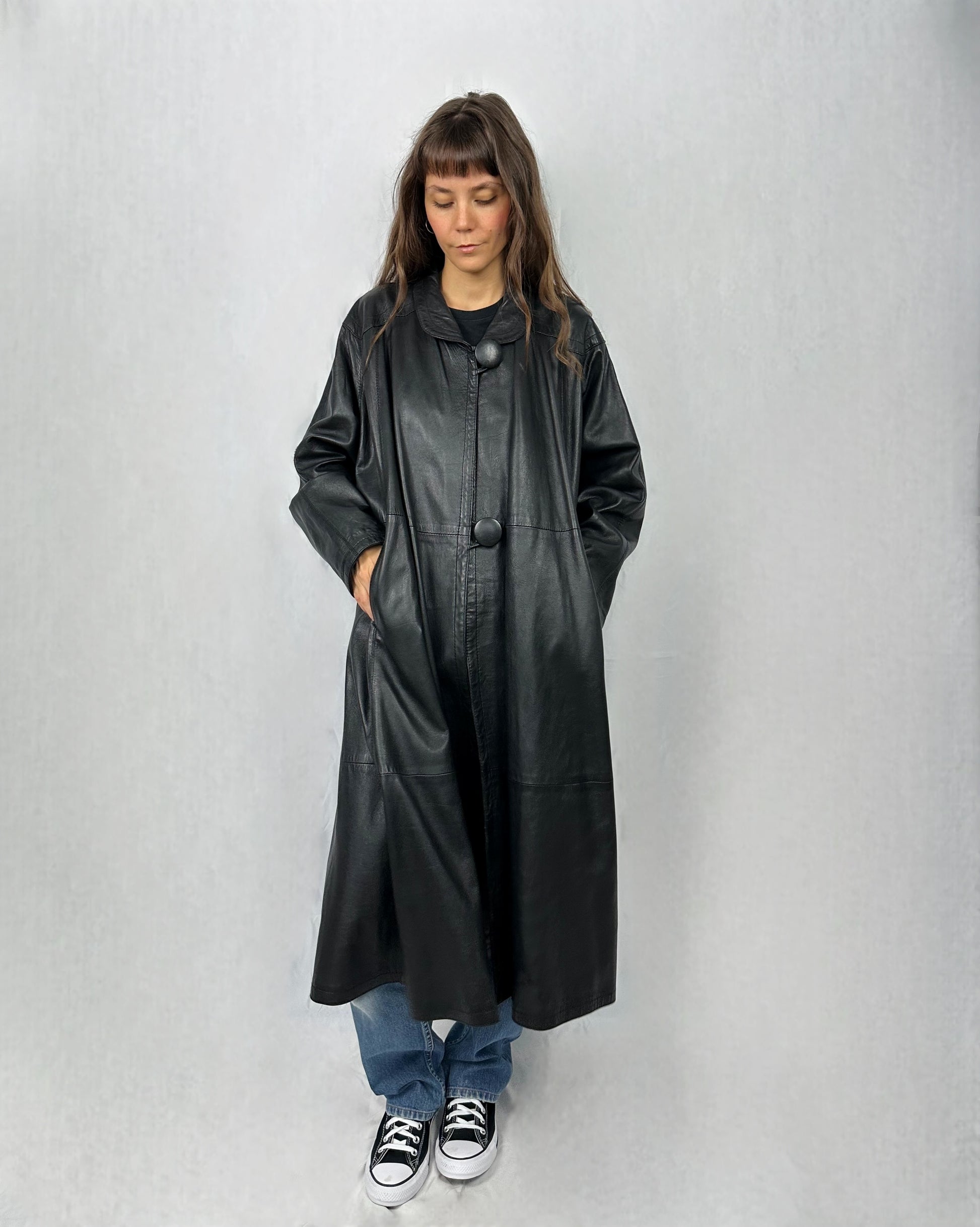 Trench lungo meraviglioso in vera pelle nera, dal taglio svasato che si amplia delicatamente verso il fondo, creando un effetto fluido e leggermente drammatico. La chiusura frontale con due grandi bottoni enfatizza lo stile minimal e sofisticato. Linee pulite e sartoriali, ideale per un look elegante ma contemporaneo.