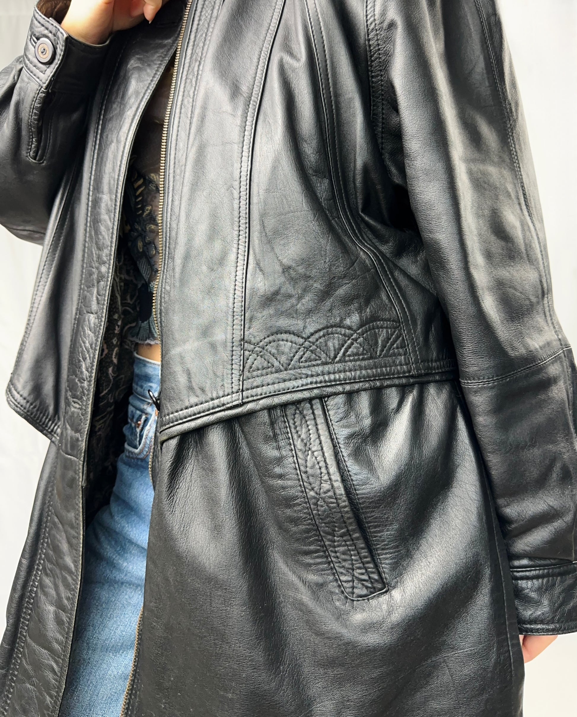 Trench in pelle dalla linea ampia ma dritta, pensato per una vestibilità comoda e strutturata. La superficie è arricchita da una fantasia a ghirigori che aggiunge movimento e personalità. Un trench distintivo, ideale per chi cerca un capo classico e allo stesso tempo originale.