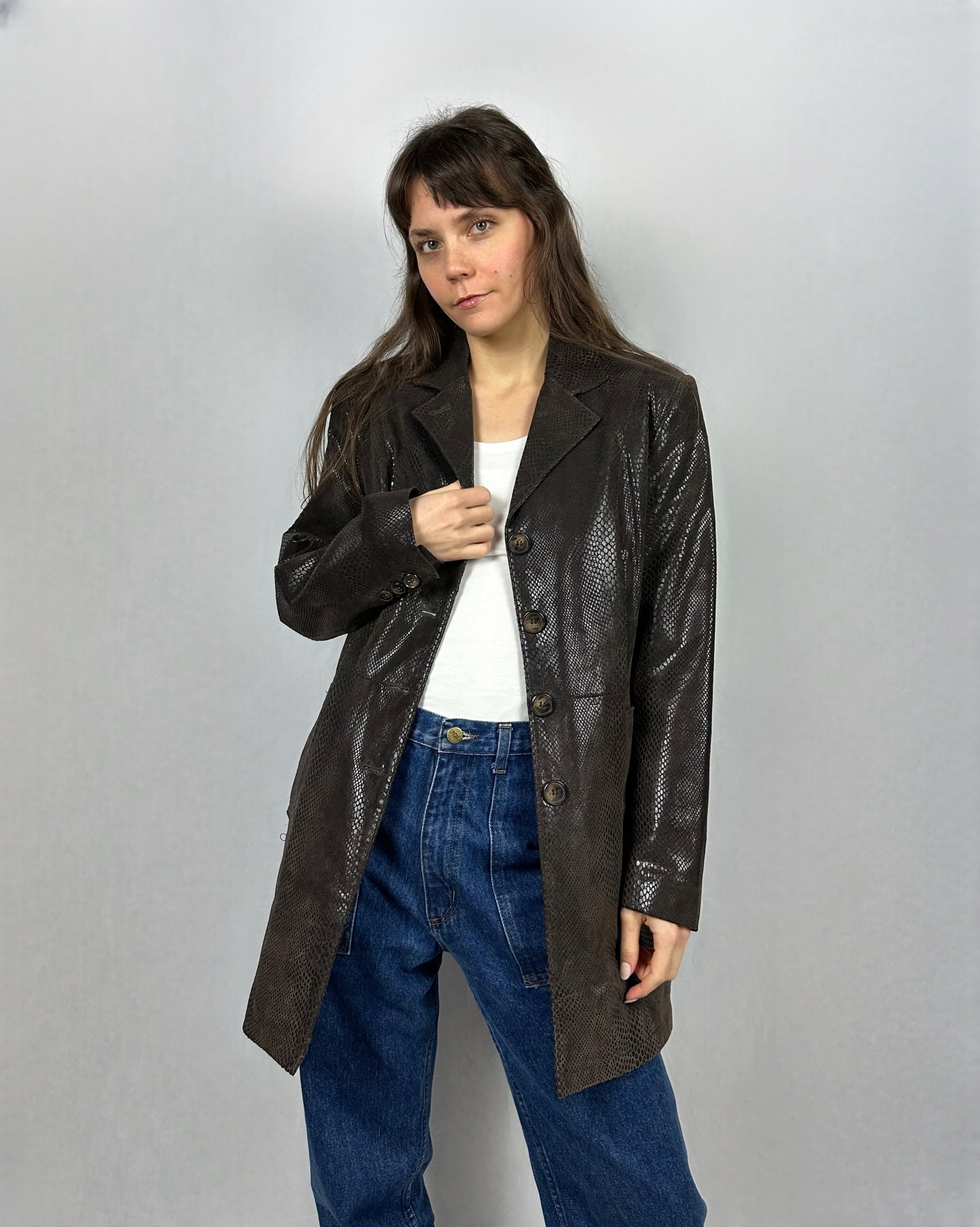 Trench corto in vera pelle marrone con affascinante stampa lucida tipo serpente. Questo capo versatile combina eleganza classica e dettagli contemporanei, perfetto per chi desidera un'aggiunta sofisticata al proprio guardaroba. La pelle autentica garantisce durabilità e comfort, mentre la stampa serpente aggiunge un tocco di personalità. Ideale per creare look raffinati sia in occasioni casual che più formali.