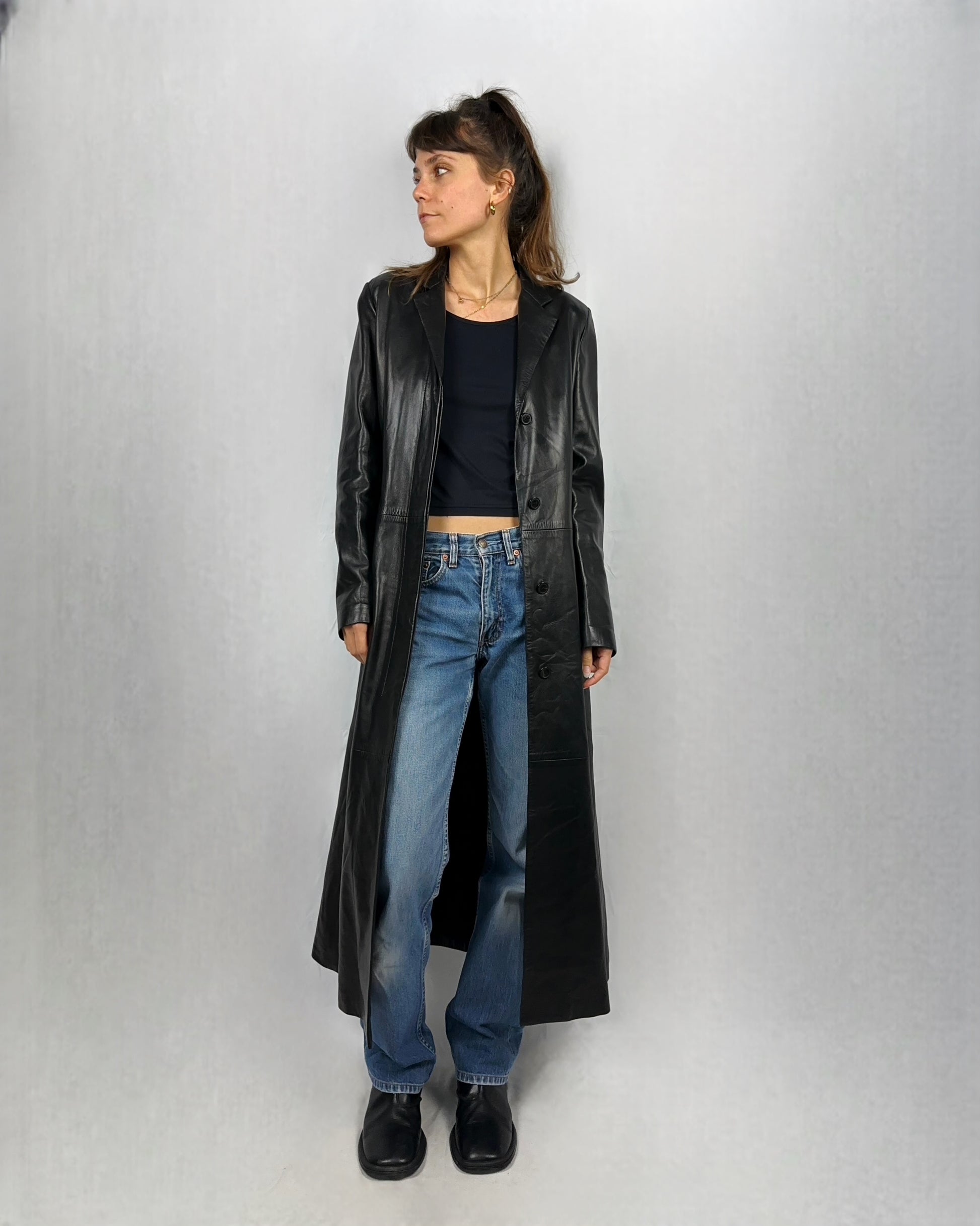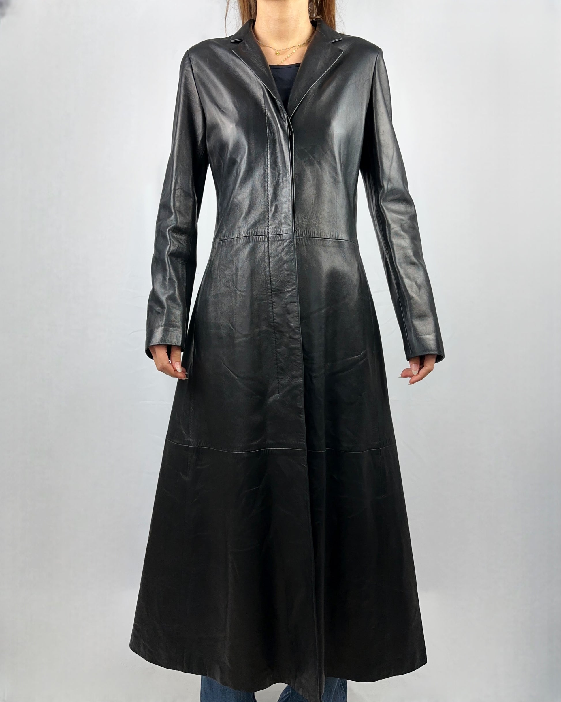 Trench lunghissimo in vera pelle nero, con vita stretta e fondo svasato. Pelle morbida e resistente, che assicura comfort e durata. Linee essenziali e design distintivo, perfetto per tutti i giorni ma anche per occasioni speciali. Brand RUFFO.