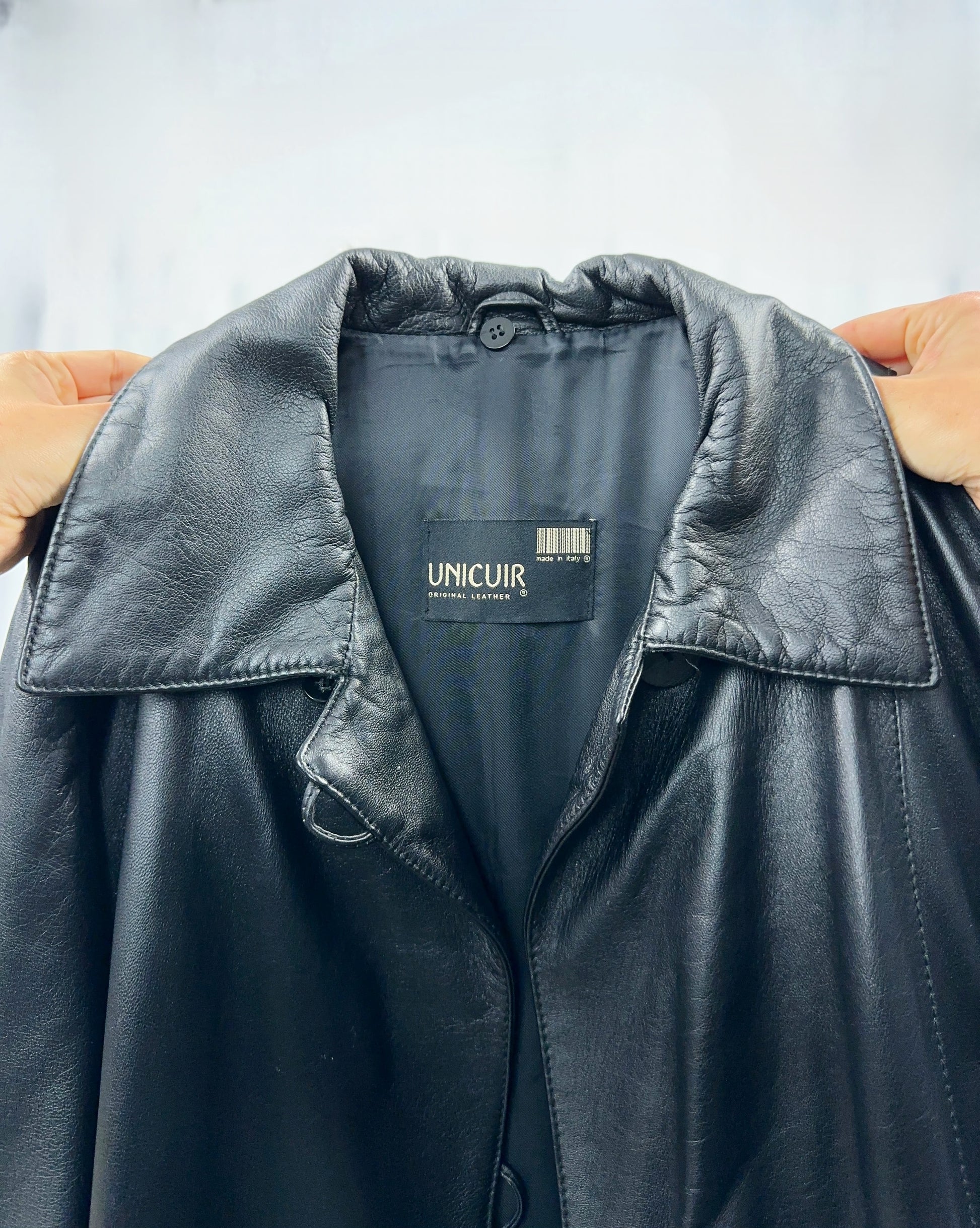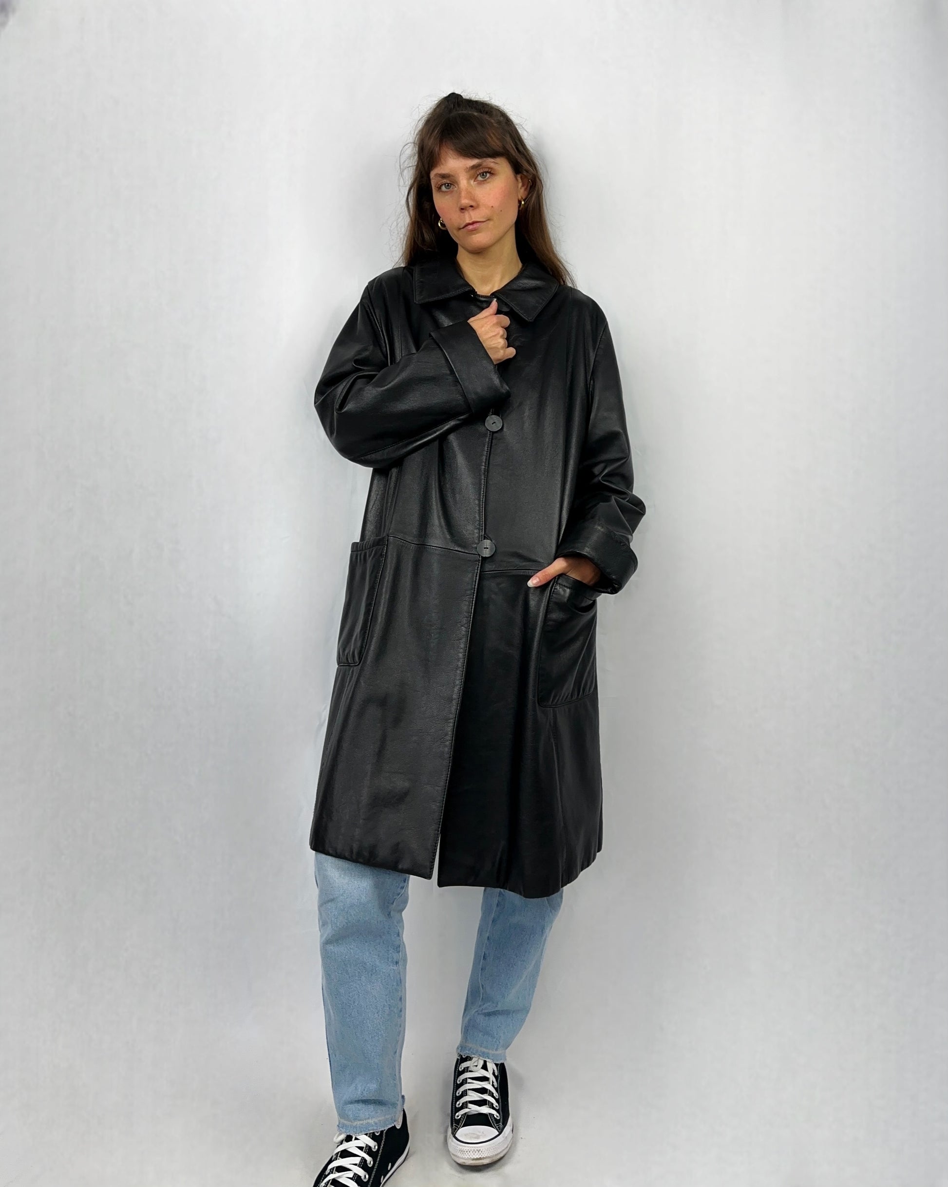 Trench ampio e dritto in vera pelle nera, morbido e confortevole. Chiusura frontale con tre grandi bottoni per un look pratico e moderno. Design essenziale e versatile, perfetto per ogni occasione.
