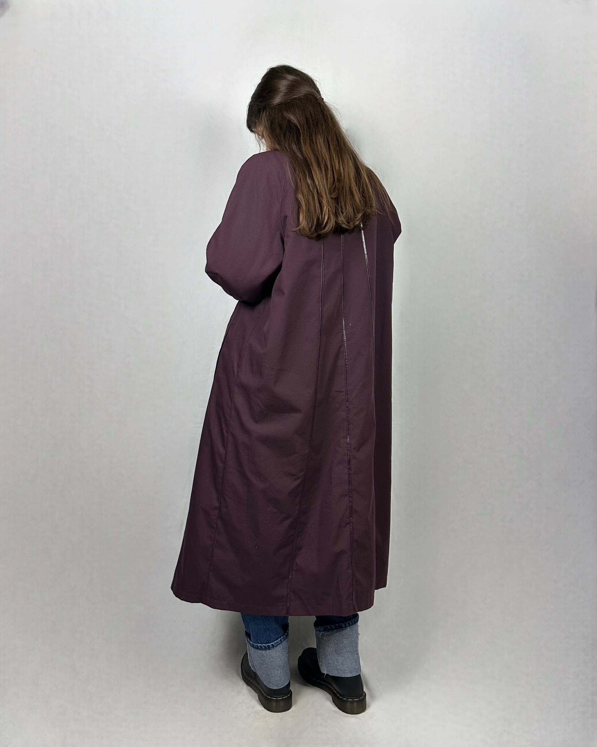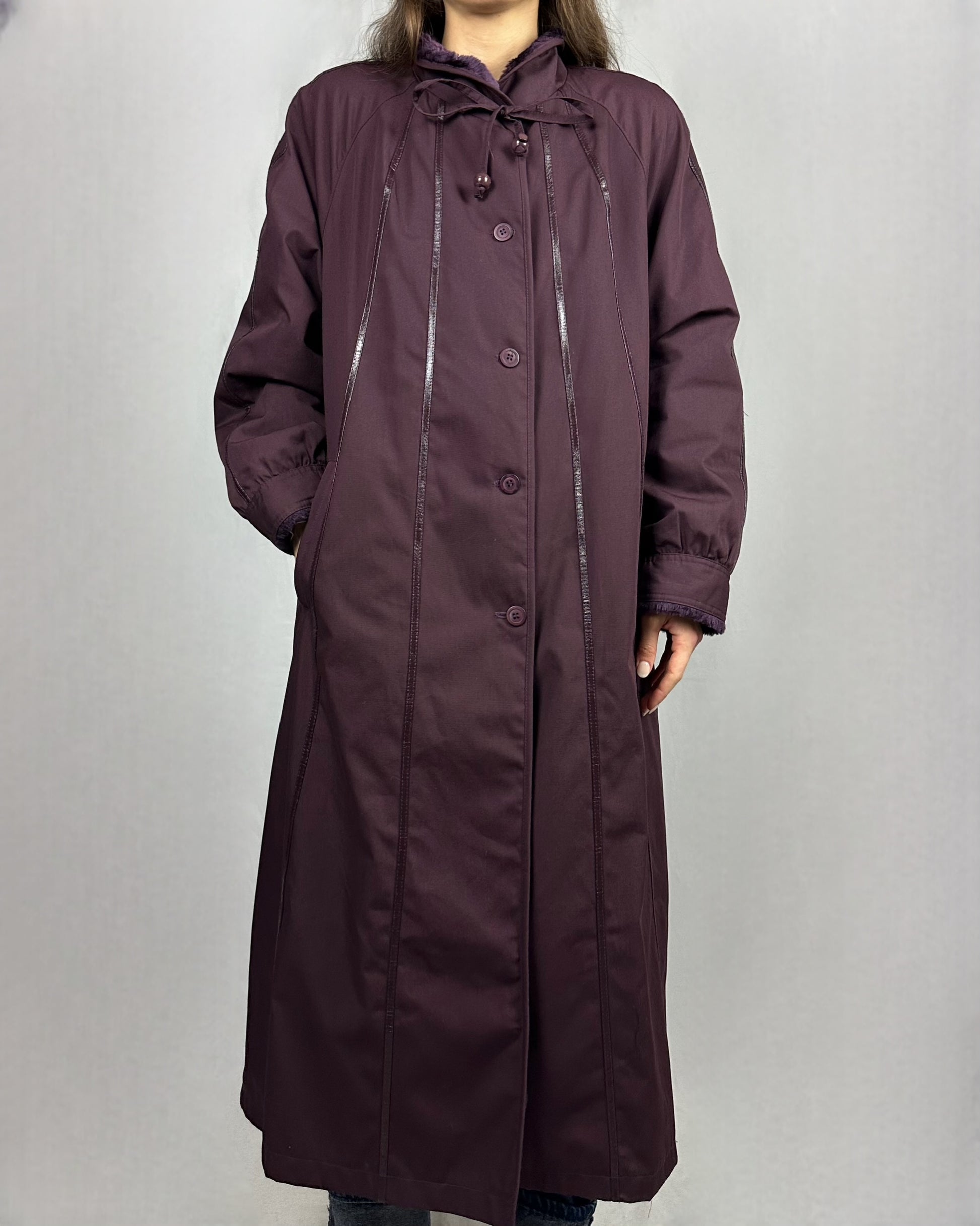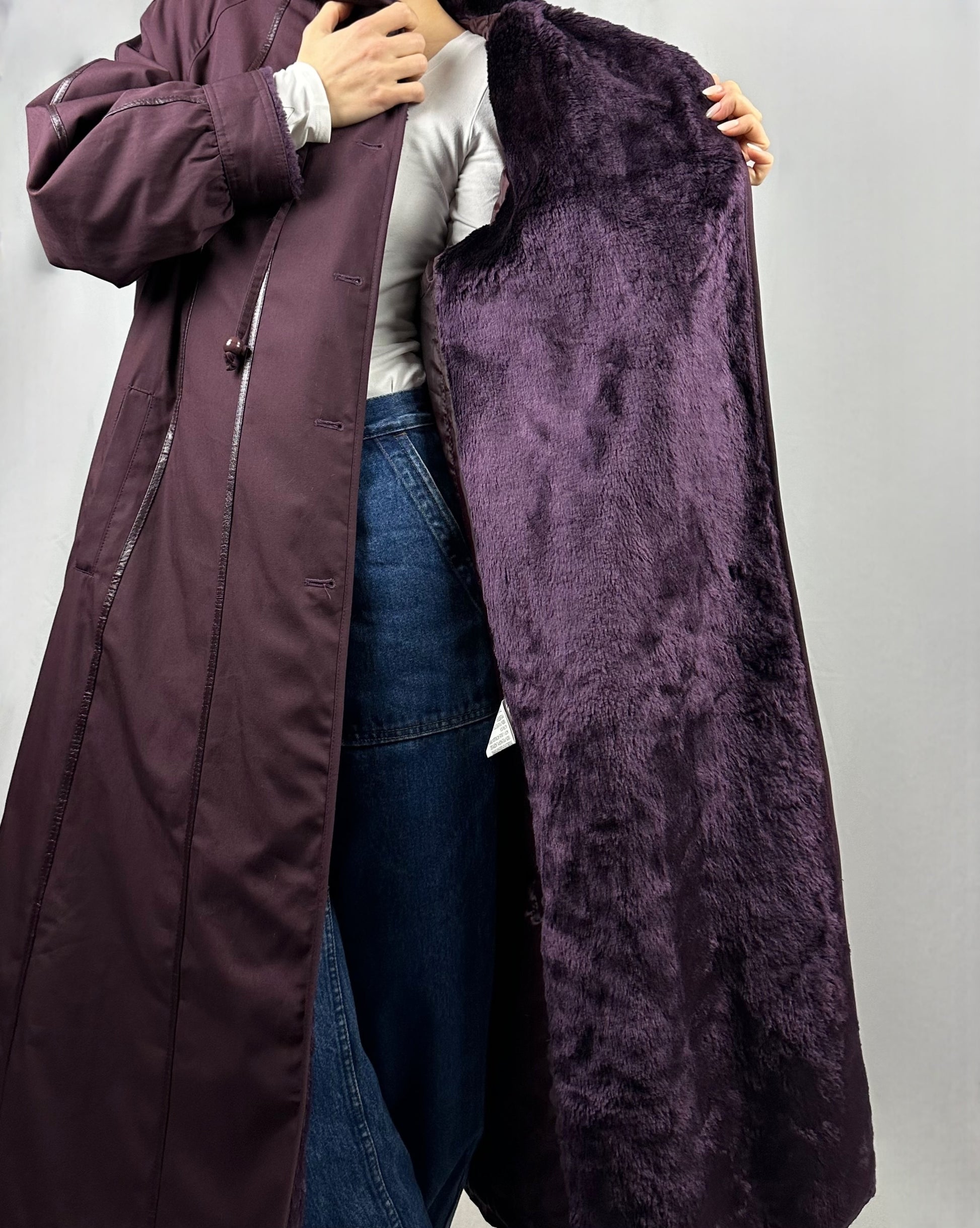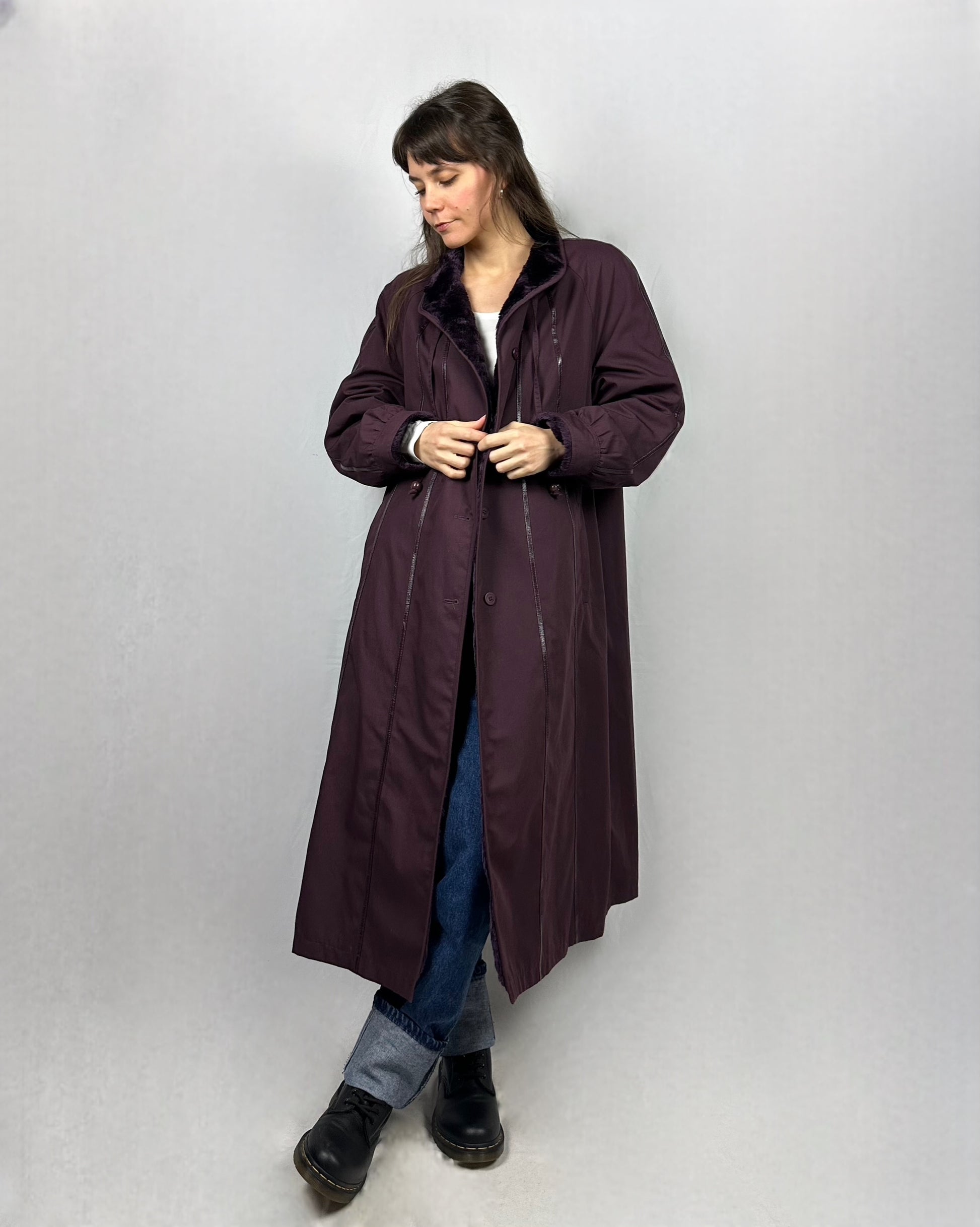 Elegante trench in tonalità prugna con interno in morbida pelliccia sintetica. Il taglio lungo e sartoriale lo rende perfetto per creare look sofisticati in qualsiasi stagione. La pelliccia interna aggiunge calore e comfort, mentre il design classico garantisce versatilità nel guardaroba. Un capo intramontabile che unisce stile e praticità.